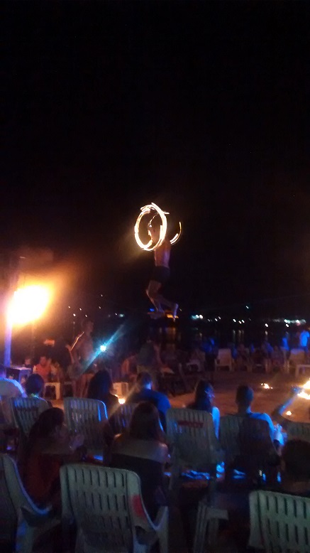 A noite, compramos 2 buckets em uma barraquinha na rua e fomos assistir o show de pirofagia. Muito top! Os caras são realmente bons, deu uma garoada de leve, mas que não abalou em nada a festa. Estava bem divertido.