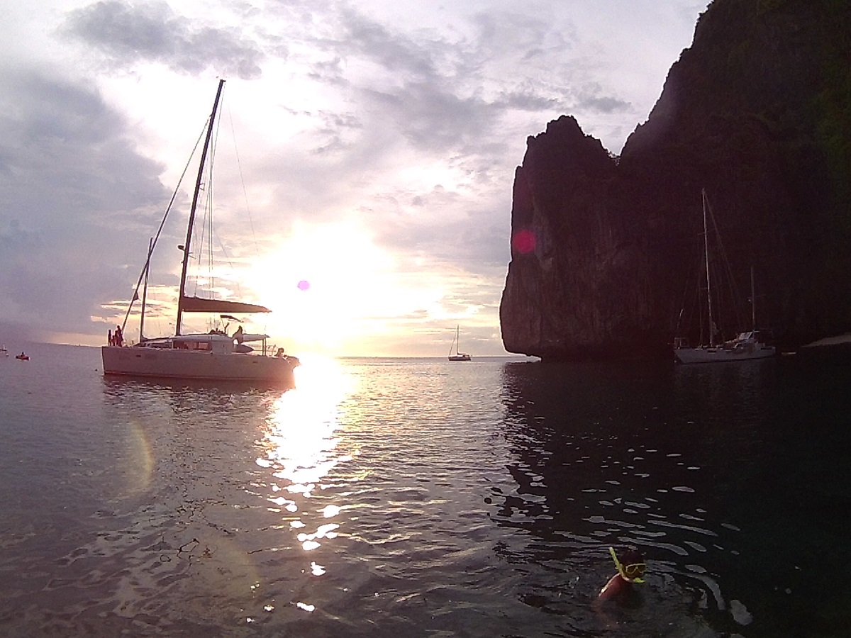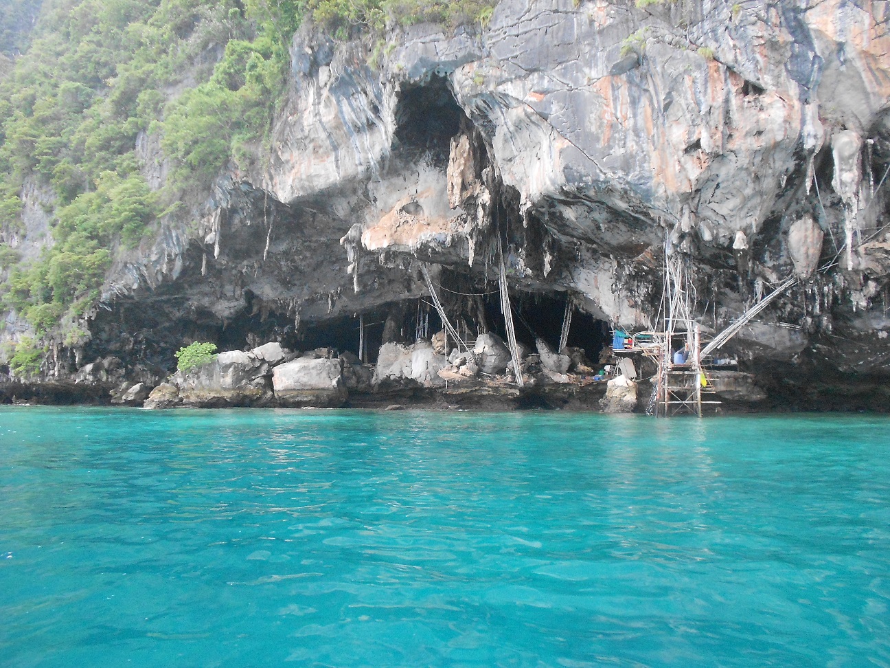Passamos pela Viking Cave, onde não se pode descer mas de fora é bem intrigante. Contornamos uma parte da Phi Phi Le, observando aquele mar azul de doer os olhos. Em certo ponto, o barqueiro faz uma parada para o snorkeling. O mar é bem transparente; o tempo estava meio fechado e começou a chover, então decidi não mergulhar.