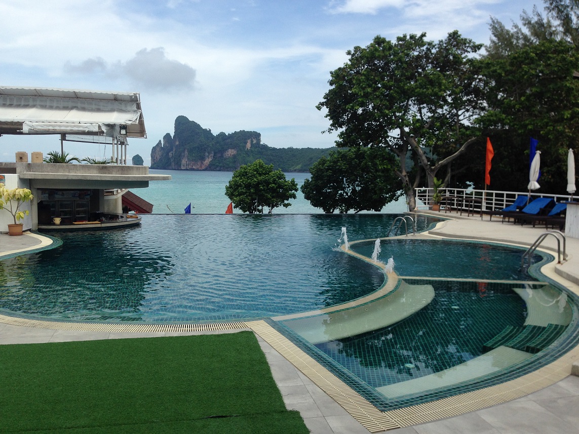 No próprio pier ficam milhares de pessoas oferencendo hospedagem. Nós já tínhamos fechado pelo a estadia no PP Charlie (mesma área comum do PP Princess, mas é a parte mais antiga). Tinha um rapaz com um mapa indicando onde o hotel ficava, e nos ajudou a achar o caminho mais facilmente. Este hotel fica a 5 minutos do pier, do outro lado da ilha. É beira-mar, tem piscina de borda infinita e neste tivemos que deixar o caução de 1.000 bahts (que é devolvido no check-out).