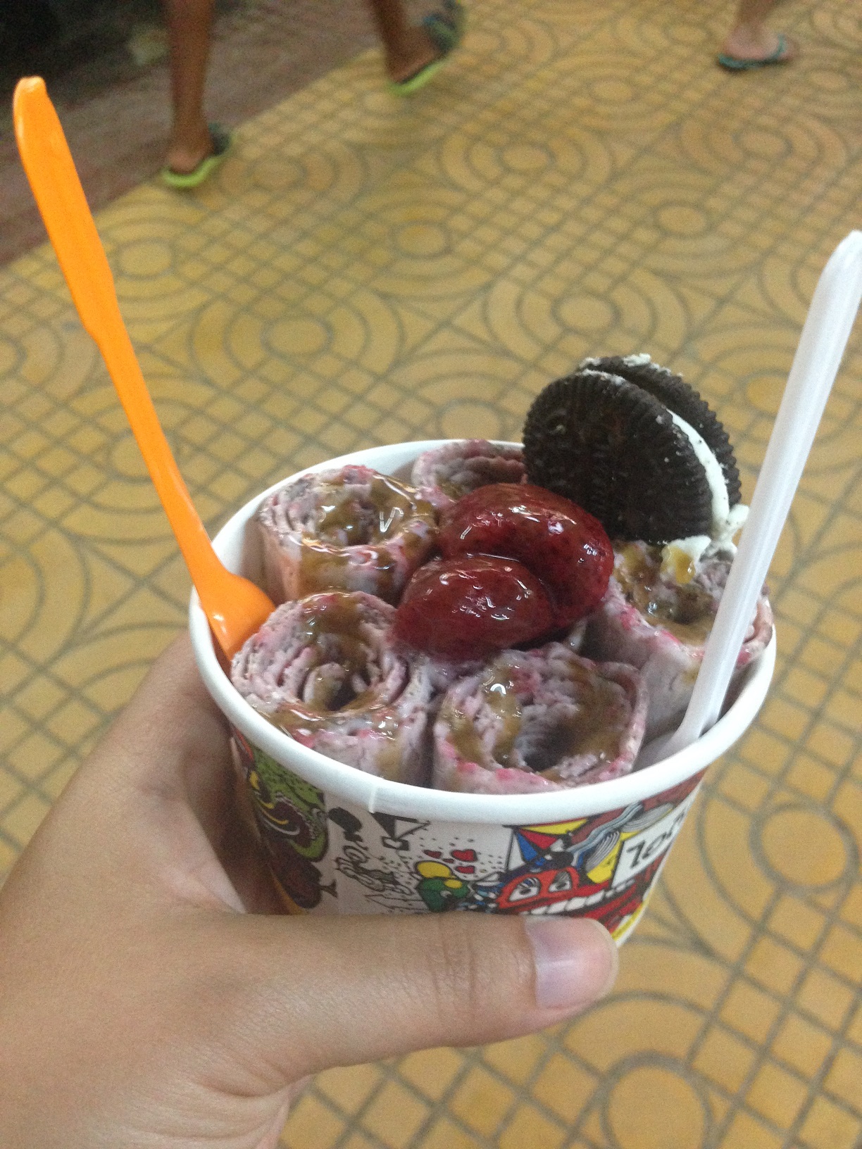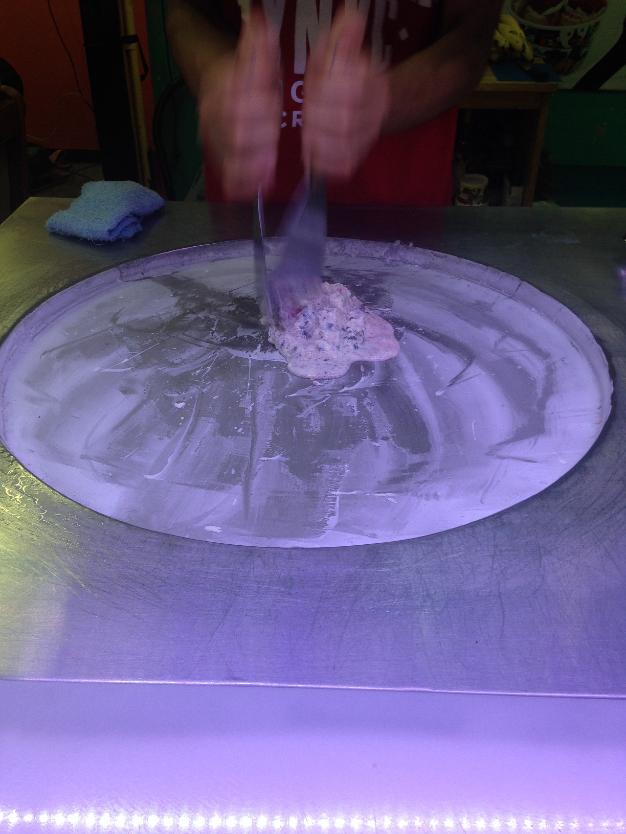 Foi em Phi Phi também que tomamos um sorvete super diferente. O líquido vai direto em uma superfície fria, as frutas e demais opções são misturadas nesta mesma superfície, e pronto! O sorvete mais caro da Tailândia (THB 99), mas uma delícia sem sombra de dúvidas.