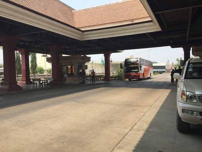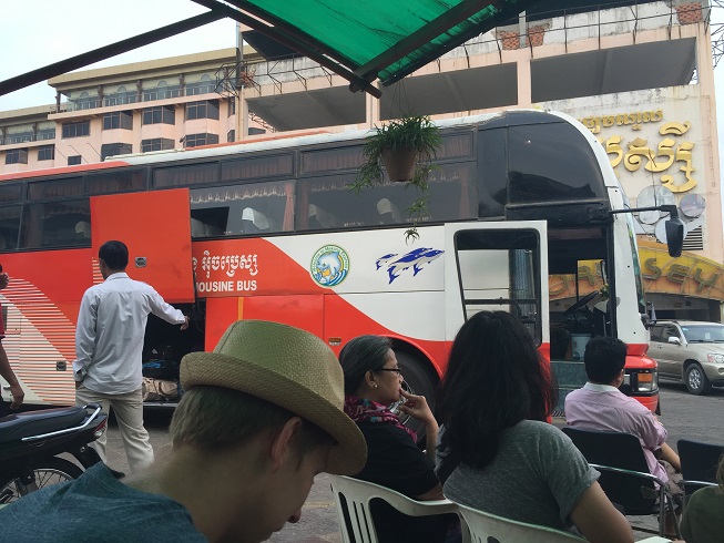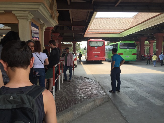 Eu resolvi viajar do Camboja para o Vietna de ônibus, e comprei a passagem na recepção do meu hotel alguns dias antes. A rodoviária de Phnom Penh é um espaço aberto onde todos os ônibus estacionam, não tem nenhuma infraestrutura. Eles checam seu passaporte e te dão um papel com o comprovante da mala.