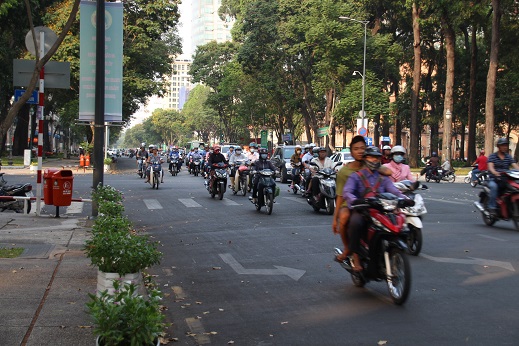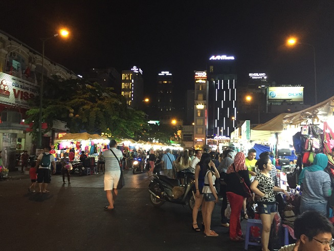 Caminhei pelo Night Market que de noite fica na rua ao lado do Ben Thanh Market. Atravessar a rua é sempre uma grande aventura; são muitas motos circulando em todo lugar.