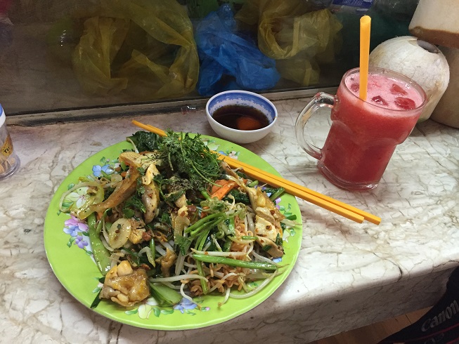 Já era 17 horas e passado do limite do almoço – bora arriscar uma comida local? Não gostei muito dessa comida, que era basicamente miojo com pedaços gordos de frango e um monte de mato. Voltei para o hotel e fechei o tour para os Cu Chi Tunnels no dia seguinte.