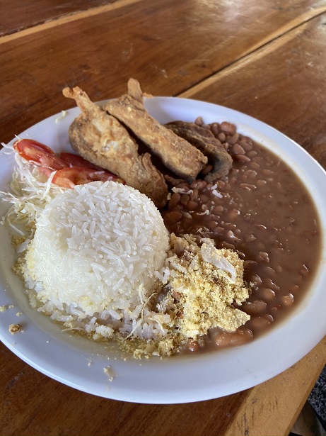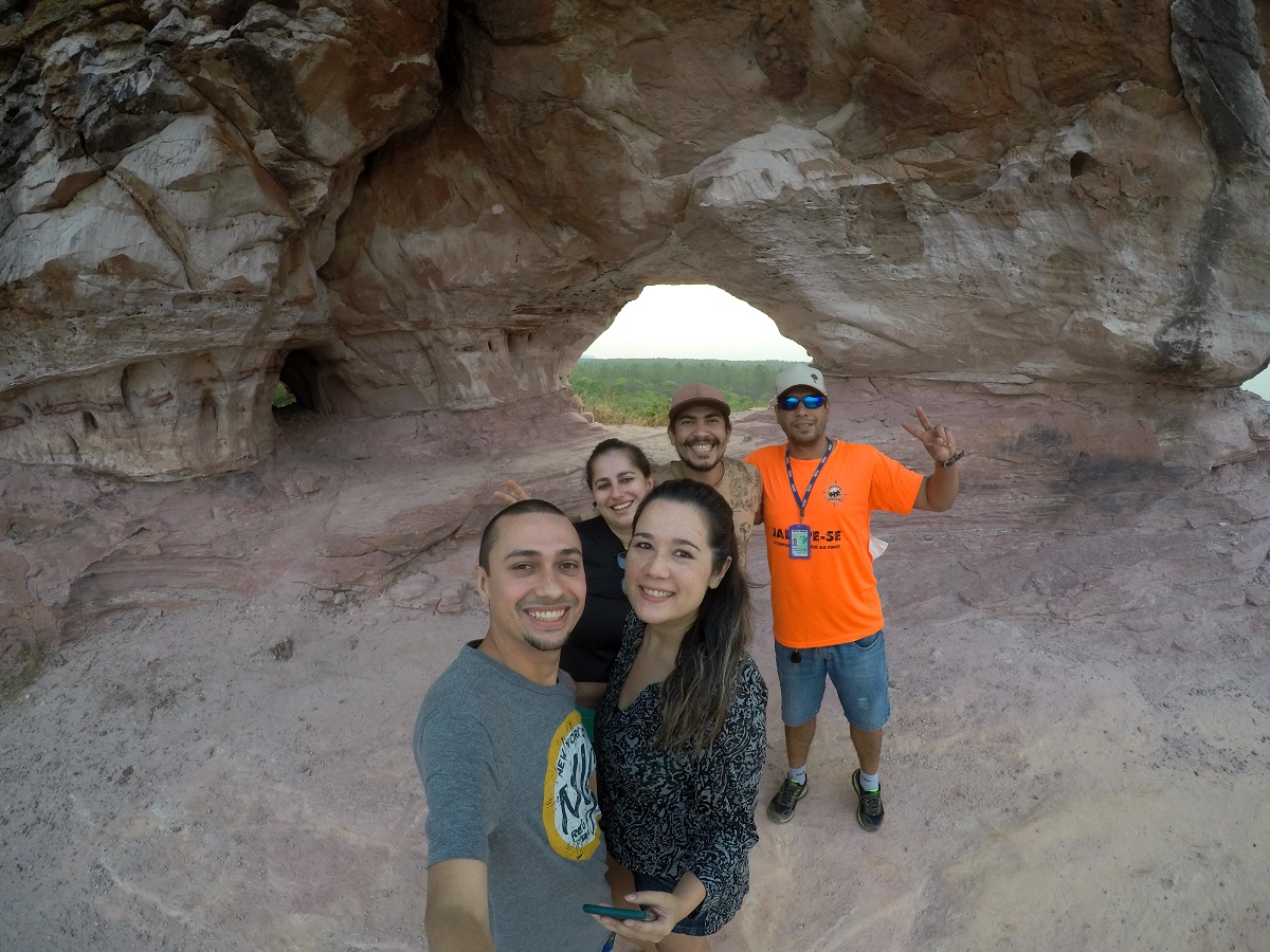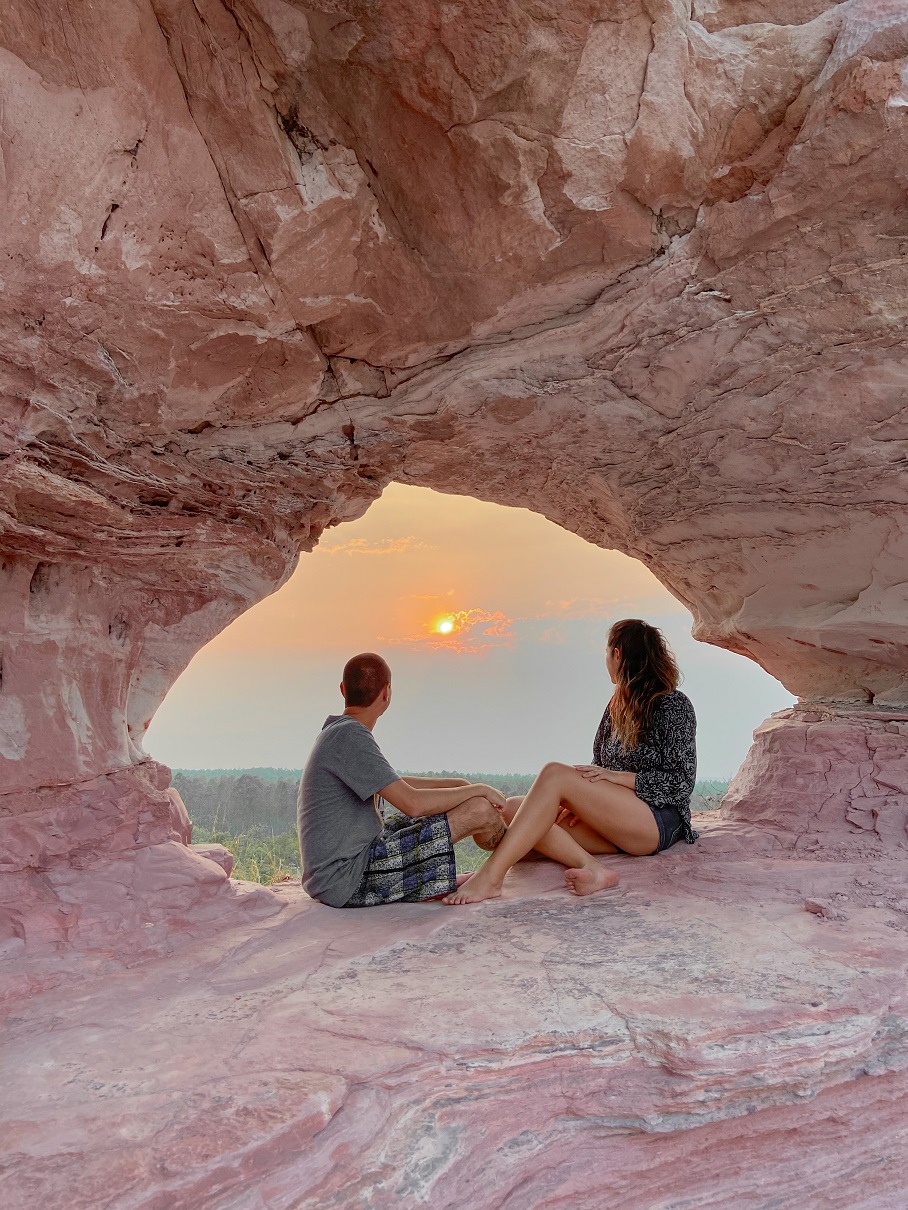 O almoço estava incluso no nosso pacote, o esquema era prato feito e a comida estava bem gostosa. Depois ainda tivemos tempo de aproveitar mais a lagoa. Saímos de lá pouco antes das 16:00, e seguimos rumo a Ponte Alta. Depois de 1 hora e pouco de estrada, bem próximo da cidade, paramos para conhecer a Pedra Furada: uma formação rochosa que tem uma cor linda, e que proporciona uma vista maravilhosa do pôr-do-sol.