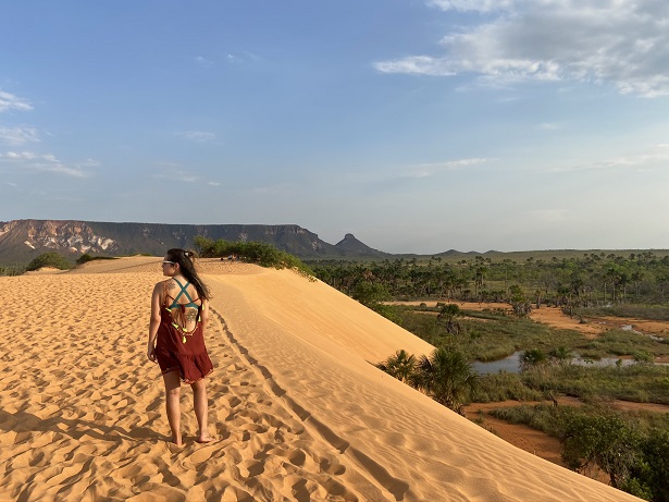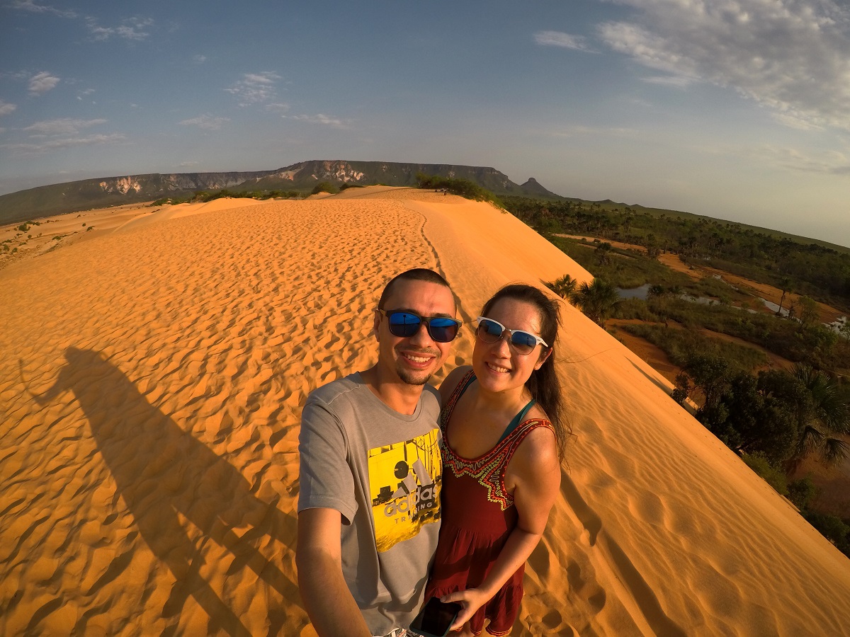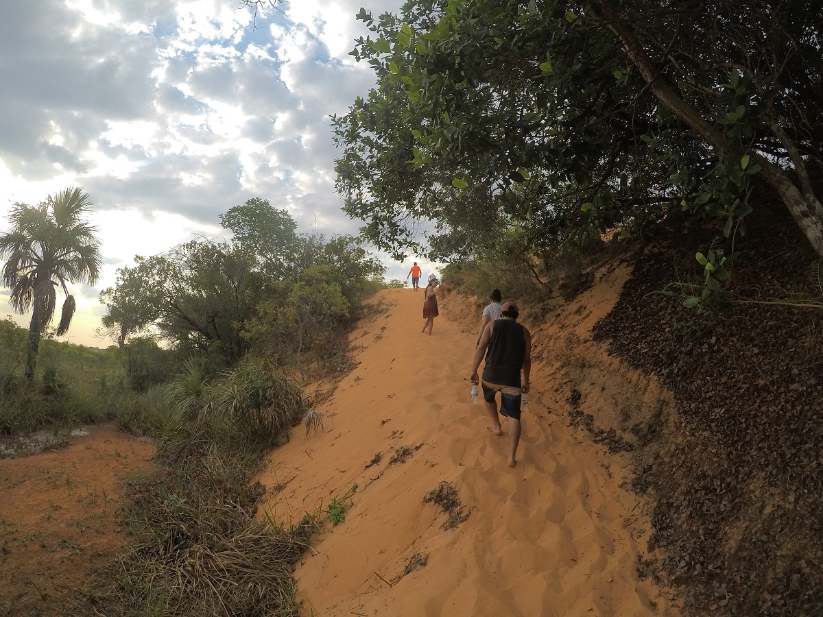 Chegamos nas Dunas do Jalapão para ver o pôr-do-sol às 16:00. Essa foi a trilha mais longa que percorremos…deve ter demorado de 7 a 10 minutos para chegar na base das dunas – dali, a subida até o topo demanda mais esforço, e se você é sedentário, pode ser um pouco sofrido. A vista de lá de cima é linda!