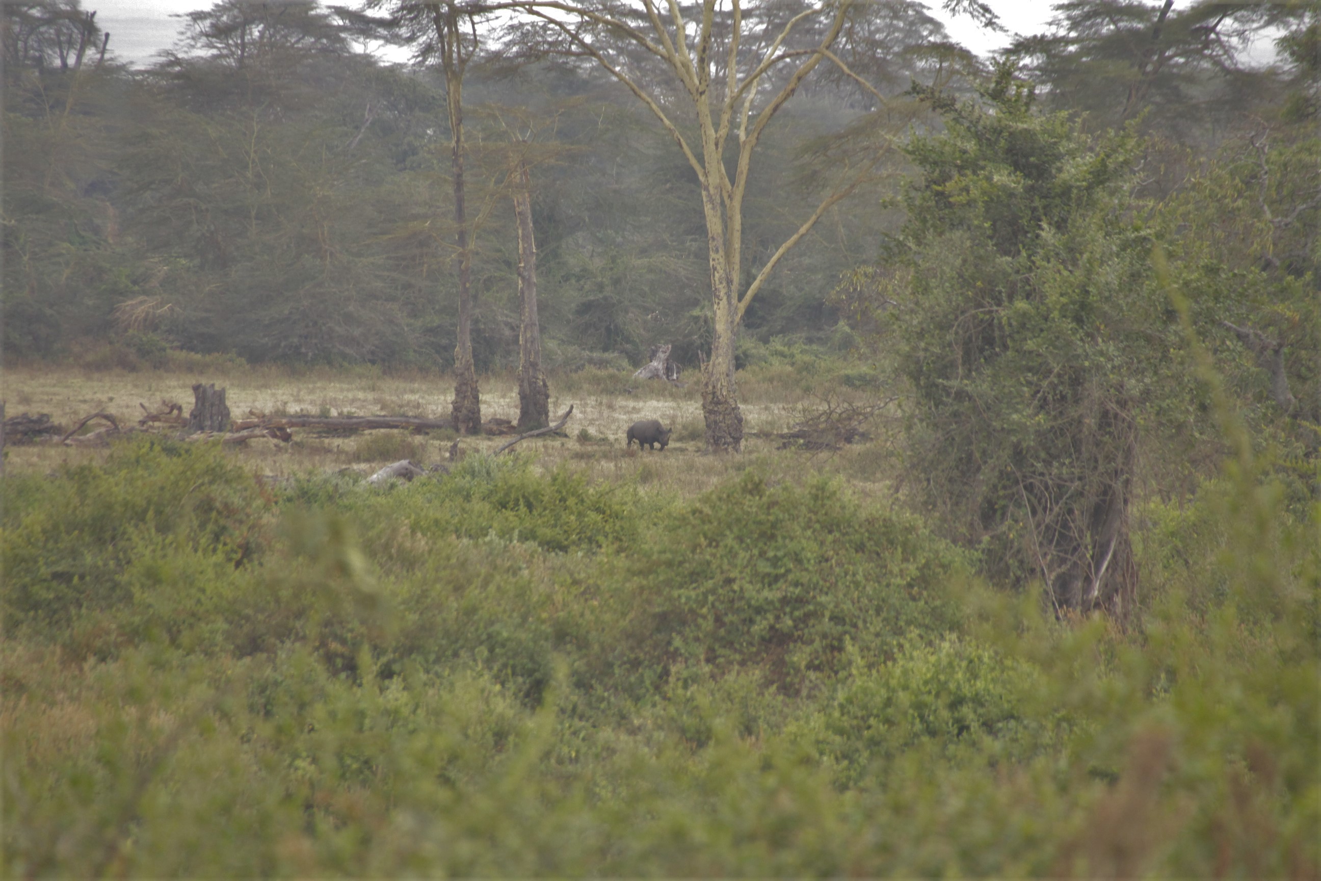 Pela manhã fazia muito frio e tinha muita neblina na nossa descida para a cratera. Logo de cara já encontramos um rinoceronte no meio da mata…estava um pouco longe mas conseguimos ver um pouquinho. Já tinham comentado conosco que não seria fácil de ver os rinocerontes pois a cratera é muito plana, e eles ficam no meio dos outros animais. Só a paisagem da cratera já vale a viagem…ela é muito particular, e eu achei incrível fazer o game drive lá.