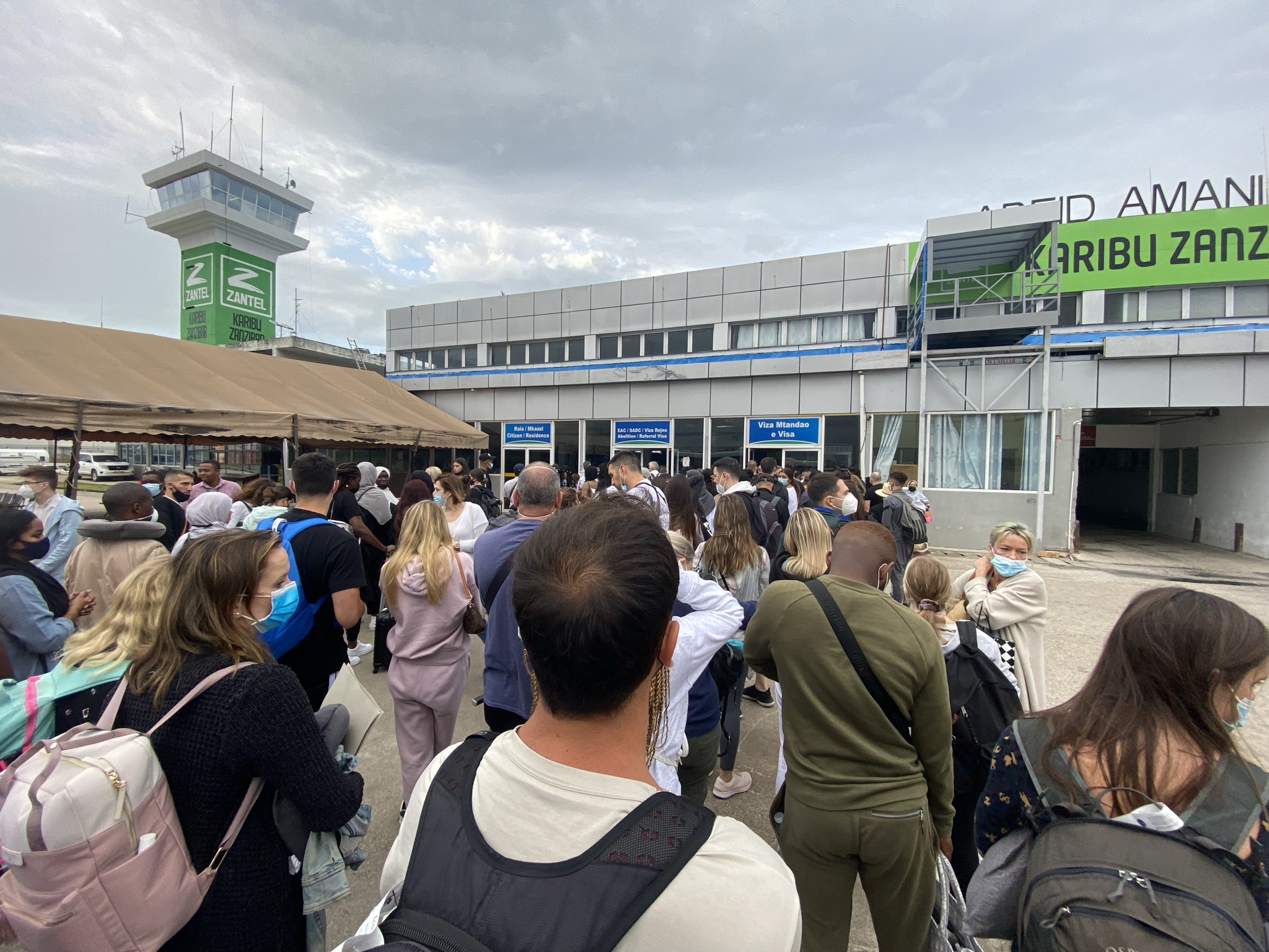 Desembarcamos no aeroporto de Zanzibar, e logo que entramos na sala de desembarque, tivemos que fazer o teste rápido de COVID – são USD 25 por pessoa, mas achamos pouquíssimo confiável o resultado…nós nem tínhamos feito o exame ainda, e o nosso resultado negativo já tinha sido assinado pelo rapaz que estava na sala. Além disso, o resultado do nosso teste foi jogado em uma pilha com outras centenas de outros resultados.