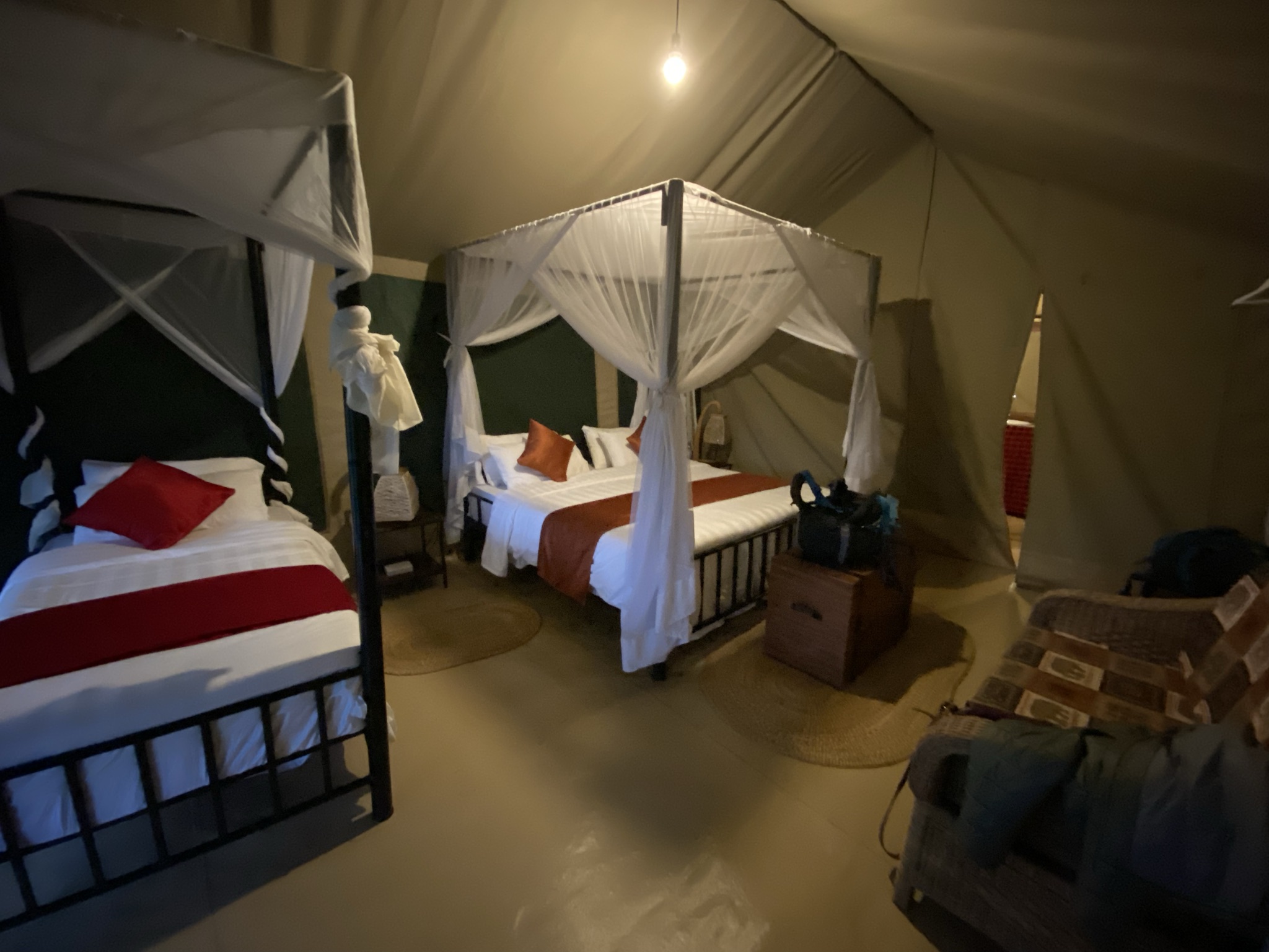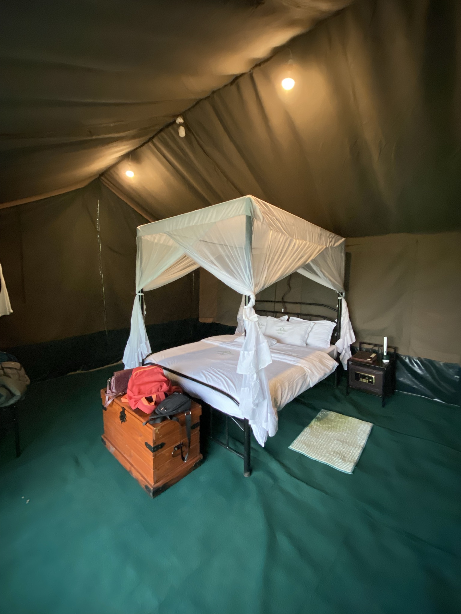 No final da tarde, seguimos para nossa tenda, no Serengeti Heritage Luxury Tented Lodge. O wi-fi funciona relativamente bem, tem água quente disponível o tempo todo, e é possível carregar os equipamentos eletrônicos no quarto.