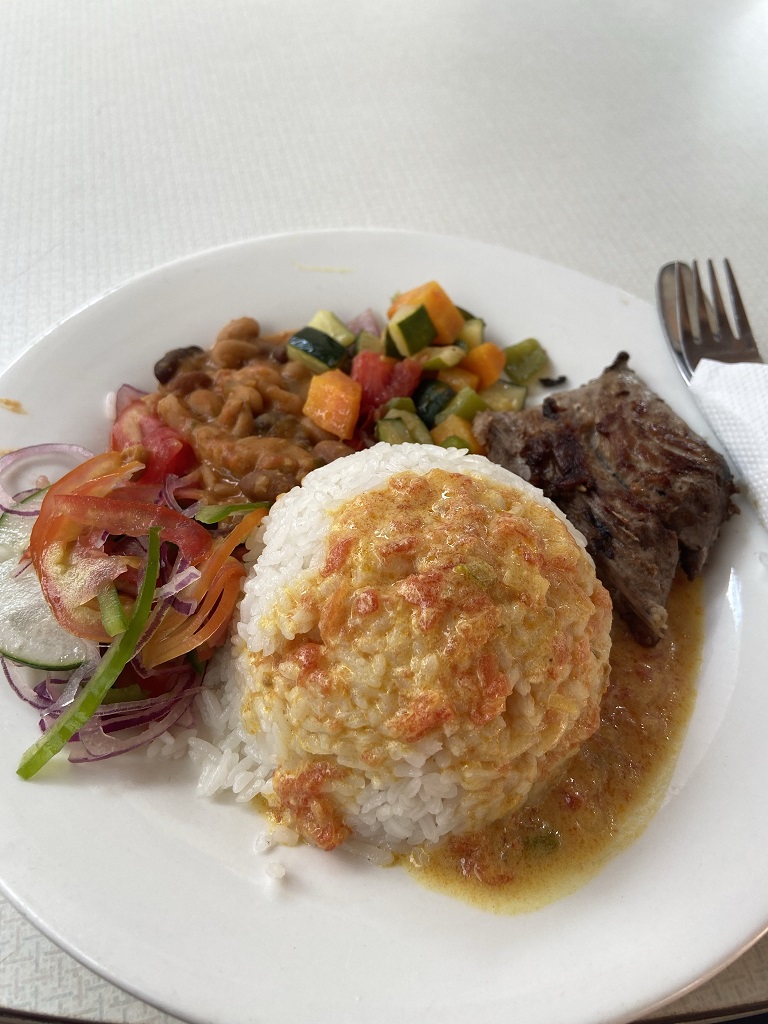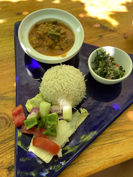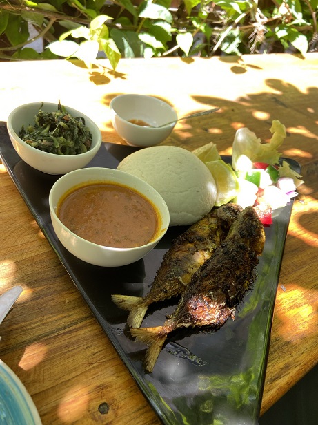 Neste dia encontramos muito por um acaso o melhor restaurante de toda nossa viagem! Almoçamos no Café Áfricano pratos locais; é um lugar super arrumadinho, a comida estava uma delícia, e foi muito barato (gastamos no total 10.000 Shillings, aproximadamente 22 Reais). O mesmo rapaz que fez o walk tour conosco, também arrumou um carro para nos levar até o aeroporto; e assim finalizamos nossa primeira viagem para a África!