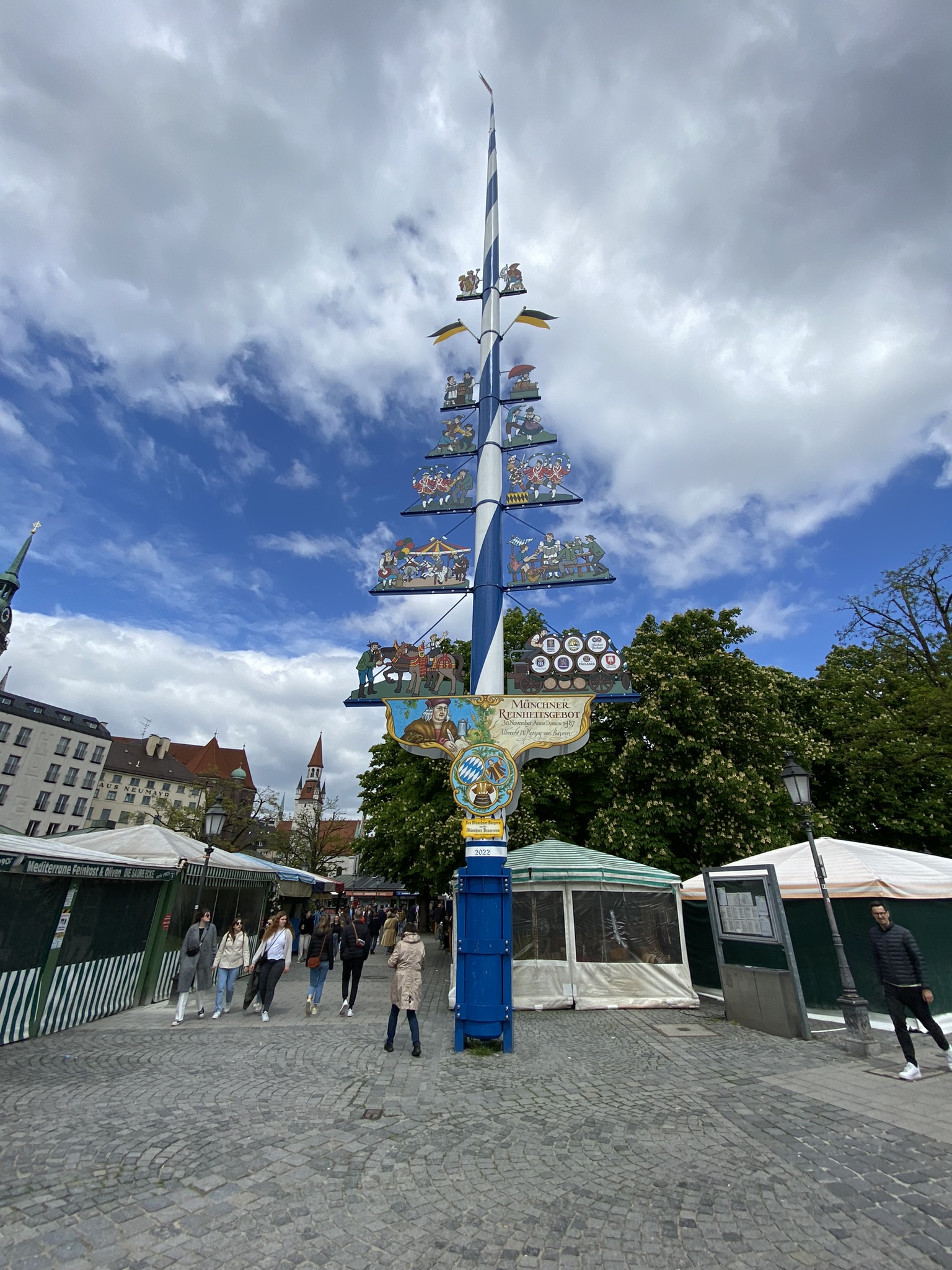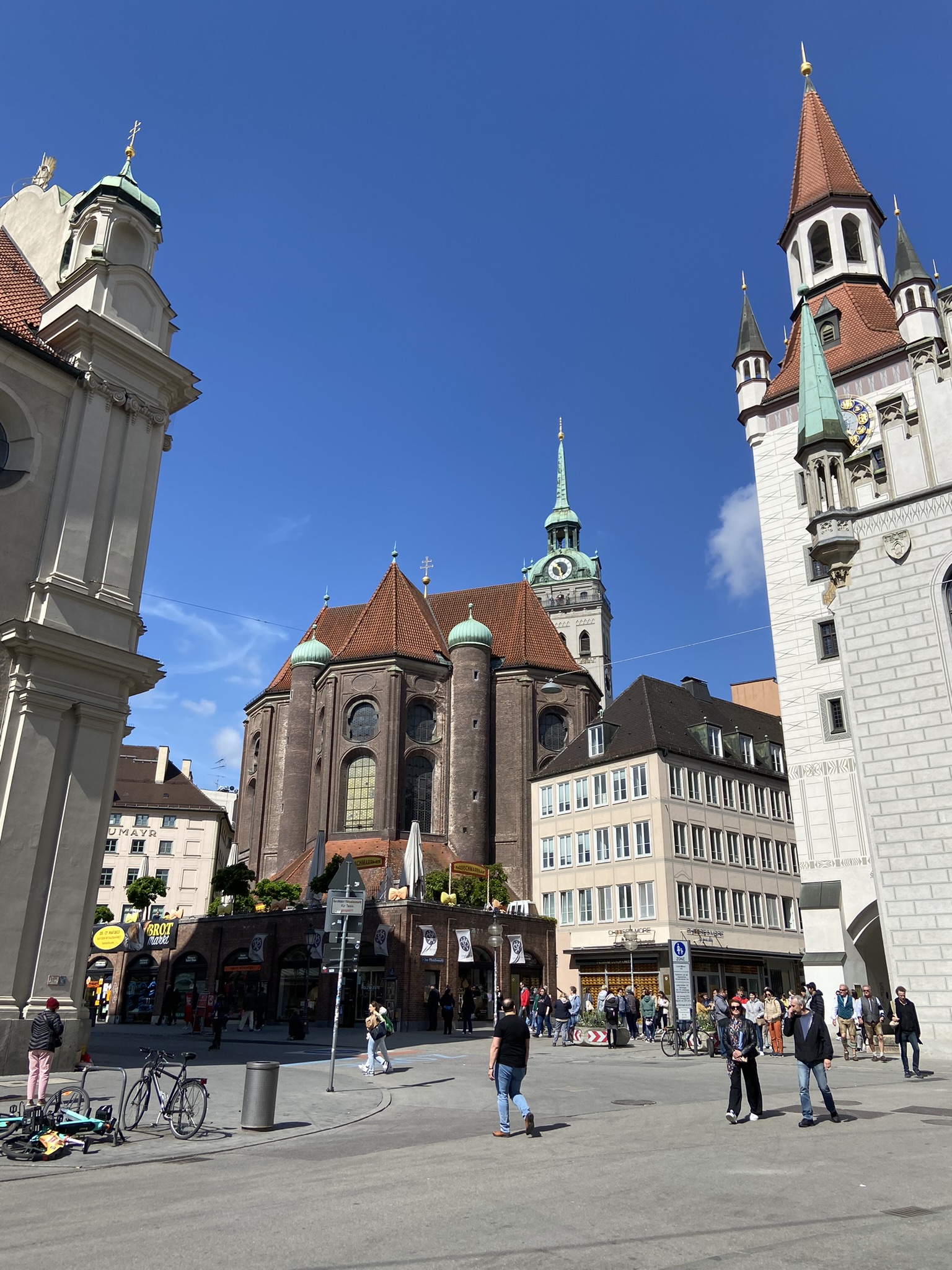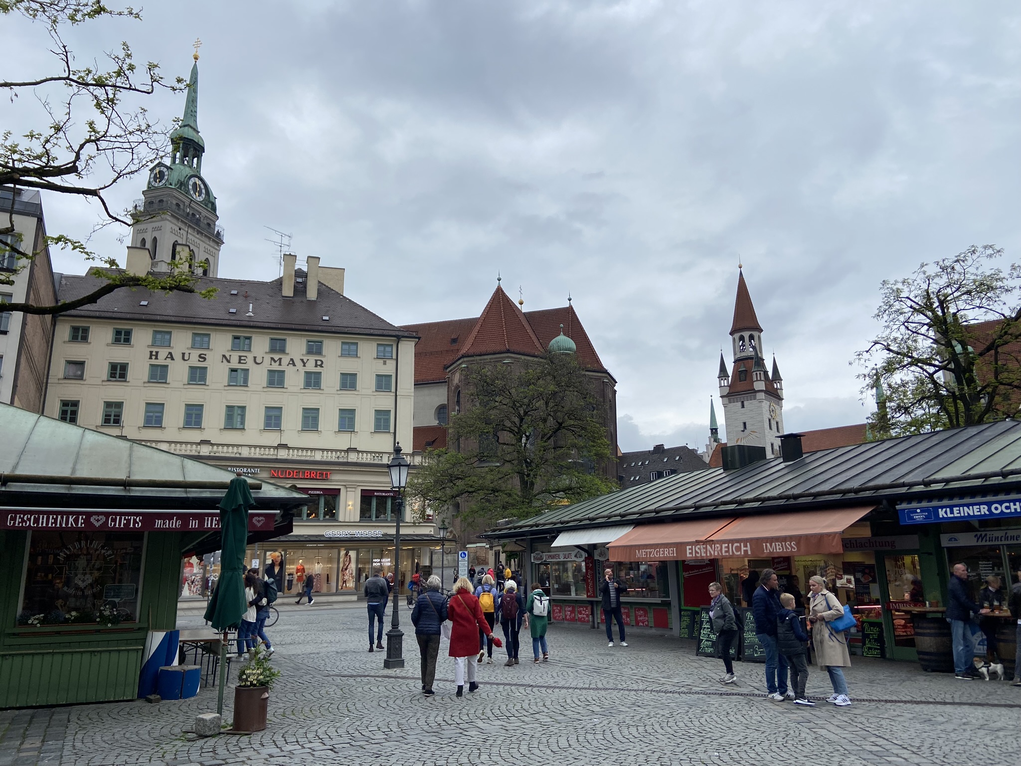 Deixamos a Brahma e a Judith (nossas doguinhas) no hotelzinho pela manhã. Nosso voo saiu de Düsseldorf às 13:30 e chegamos em Munique por volta das 14:40. Retiramos o carro no aeroporto, que usaríamos pelos próximos 7 dias. Um casal de amigos já estava no centro de Munique e fomos direto para lá encontrá-los. Existem vários estacionamentos subterrâneos, e paramos em um cuja saída fica no Eataly, muito próximo do Viktualienmarkt, onde encontramos nossos amigos, comemos e bebemos no biergarten que tem lá. O banheiro é “gratuito”, porém na entrada você vai encontrar uma pessoa que é responsável pela manutenção dos banheiros, e espera por uma gorjeta – vimos ela discutindo com várias pessoas, que estavam usando o banheiro e não estavam deixando nada no potinho de gorjeta.