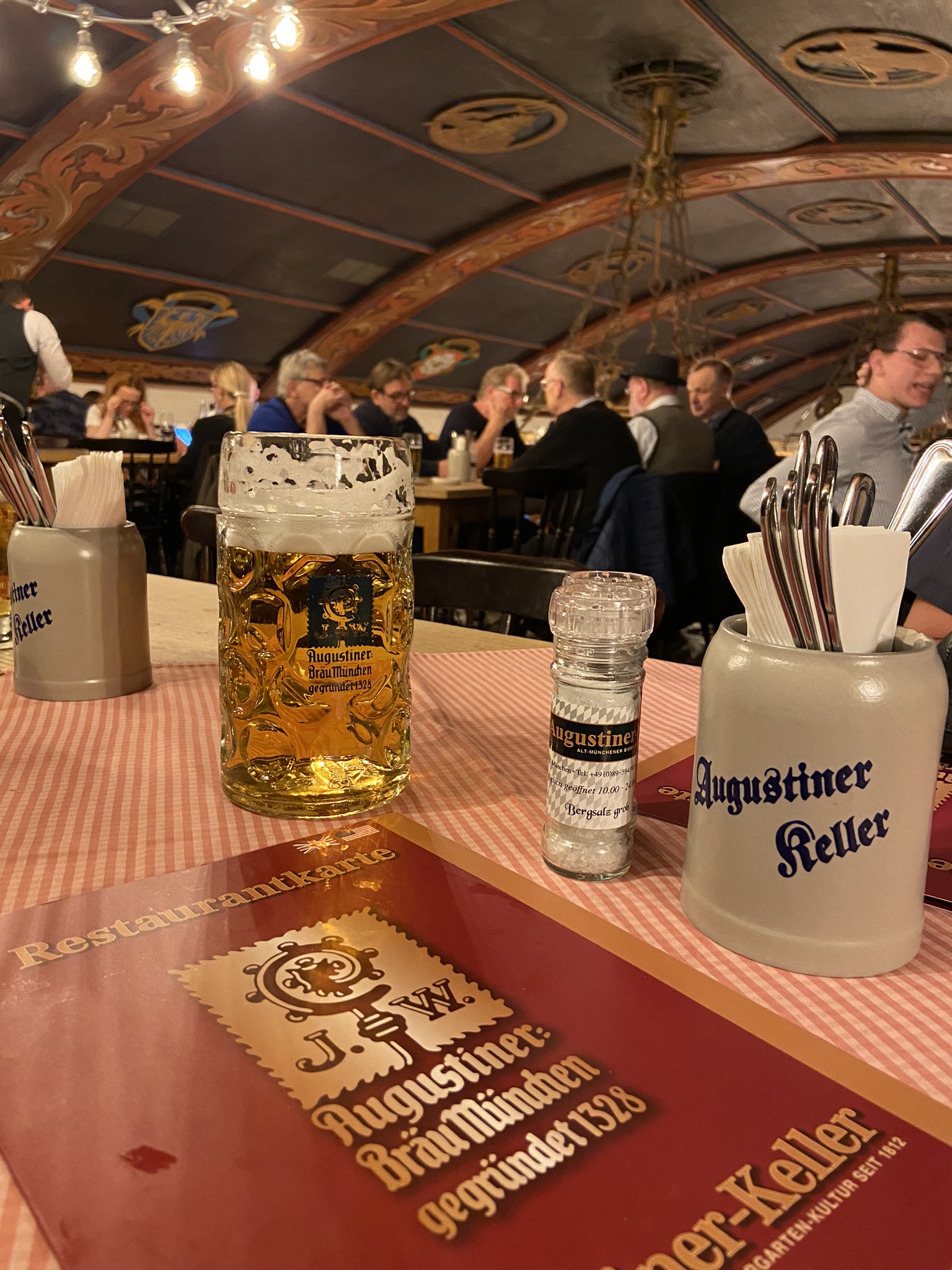 Já era final de tarde e os restaurantes estavam cheios, a Augustiner (também é uma cervejaria típica de Munique) tinha até fila do lado de fora. O Felipe acabou descobrindo uma Augustiner um pouco mais afastada do centro, e decidimos tentar jantar por lá.