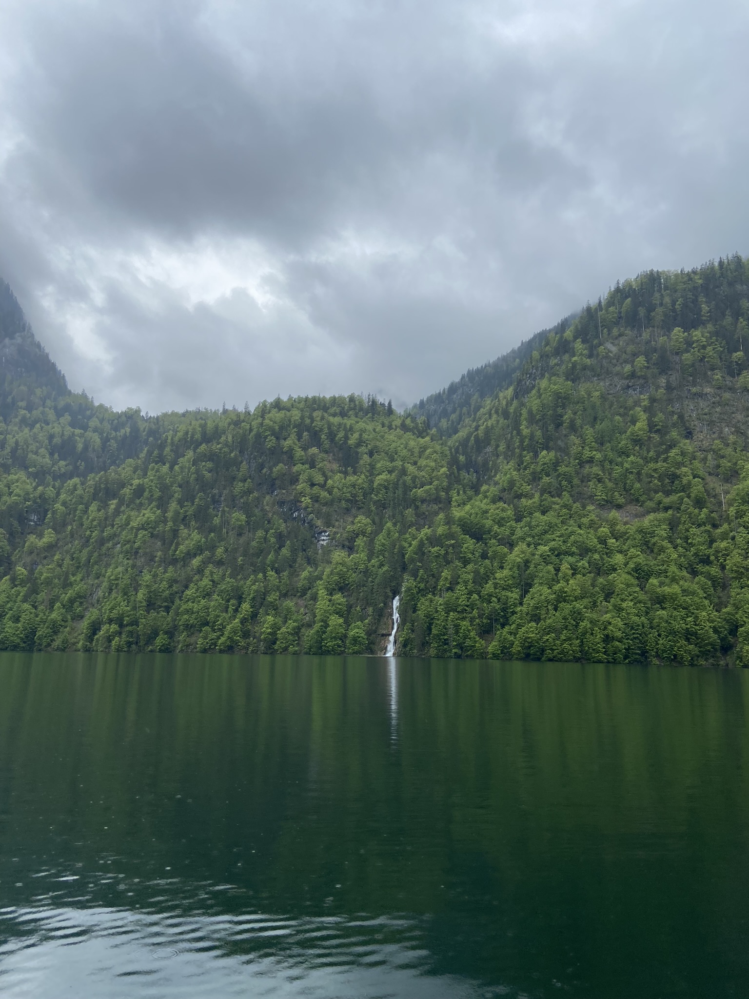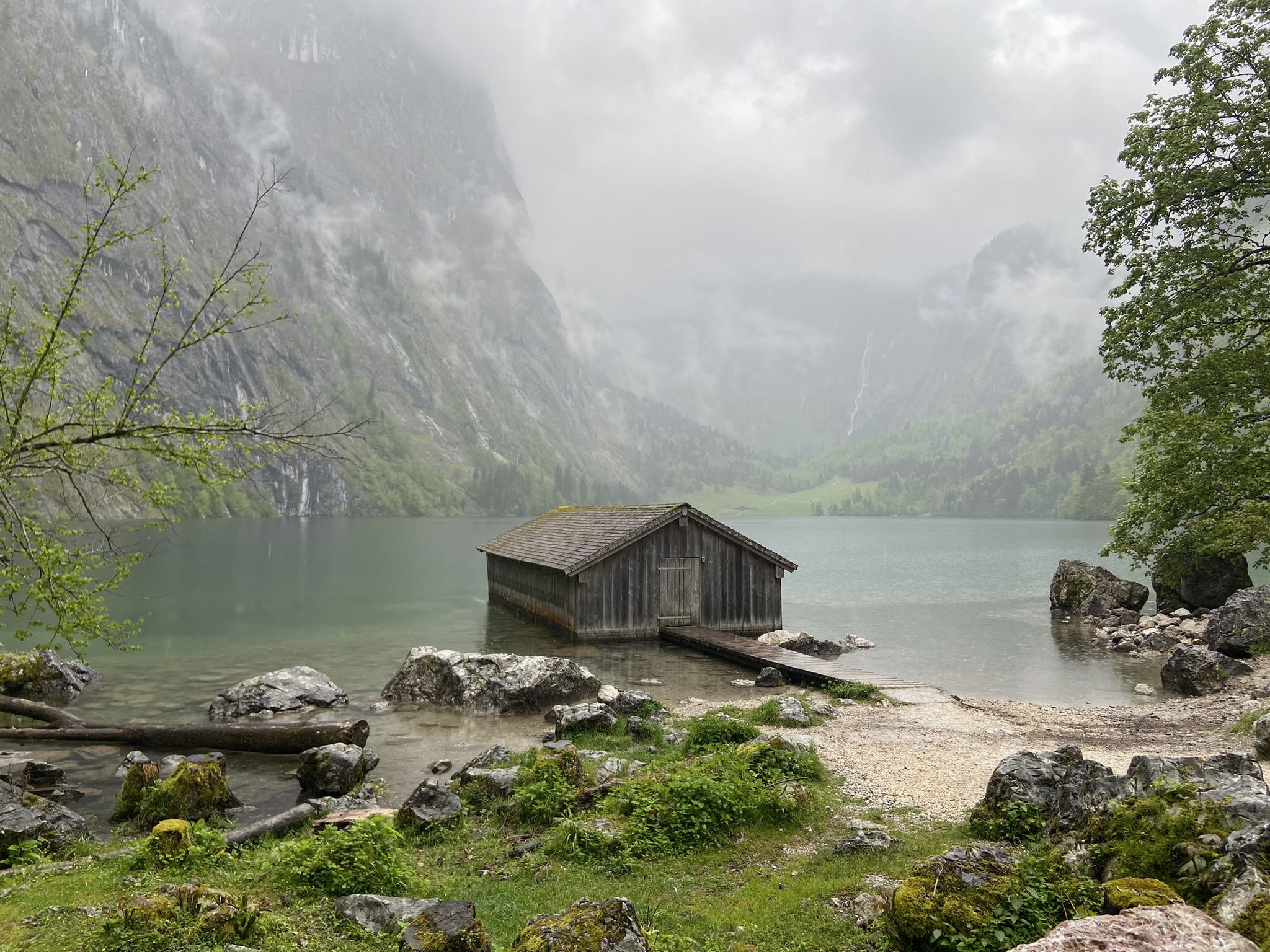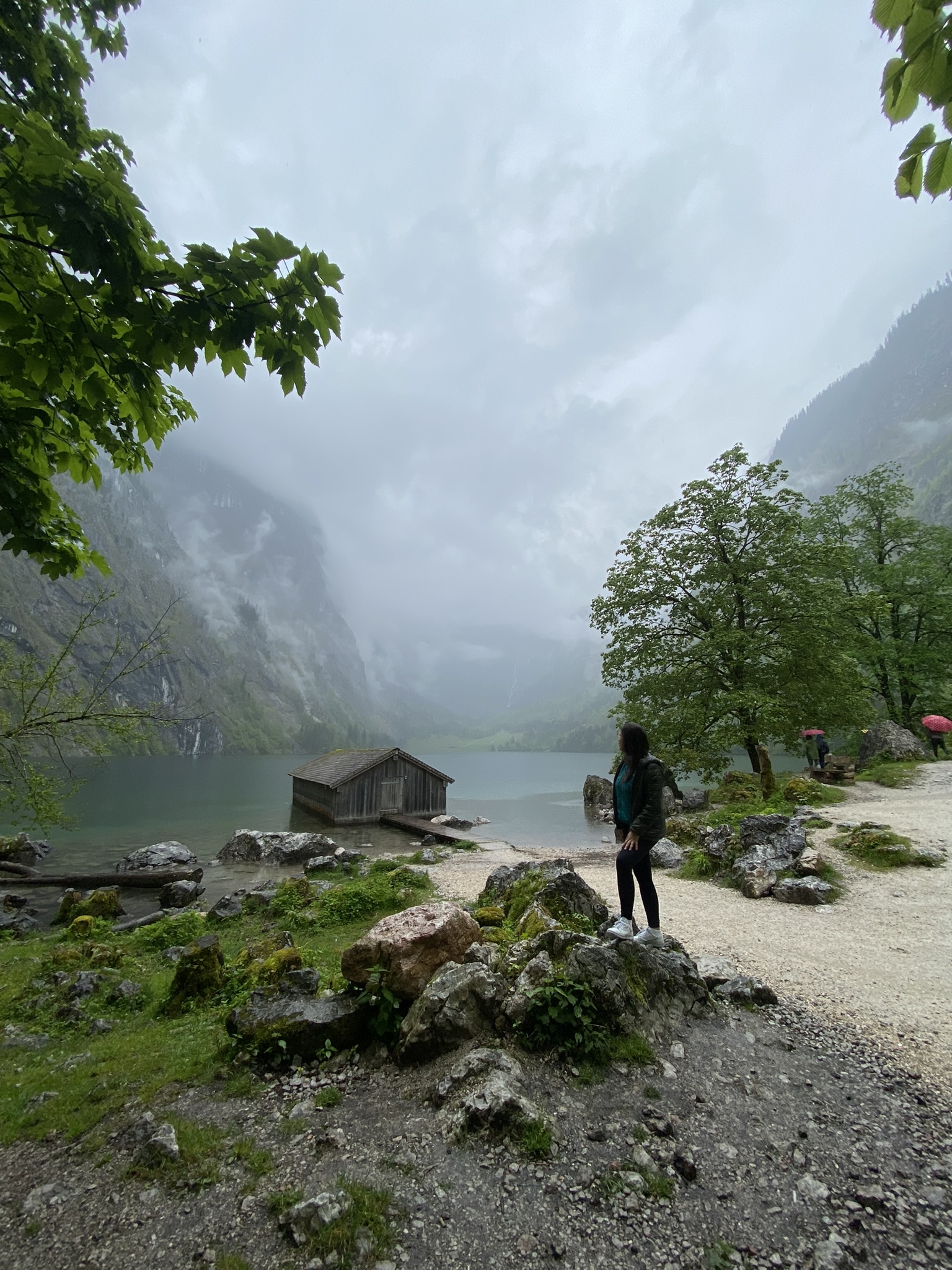Dali nós já poderíamos voltar para o ponto de partida, porém decidimos estender o passeio até a segunda parada: Obersee, um lago menor e que pode ser contornado através de uma trilha de mais ou menos 1 hora de duração. Assim que descemos do barco, começou uma chuva fina mas intensa. O Felipe levou a capa de chuva, mas eu acabei ficando enxarcada! A paisagem é maravilhosa, tiramos algumas fotos mas tivemos que voltar – não tenho dúvidas de que esse passeio em um dia ensolarado é incrível, e por esse motivo deve ficar bastante cheio. Resolvemos almoçar na vila do Königsee mesmo, já que tinha várias opções de restaurantes e não sabíamos se teria outras opções no caminho de volta.