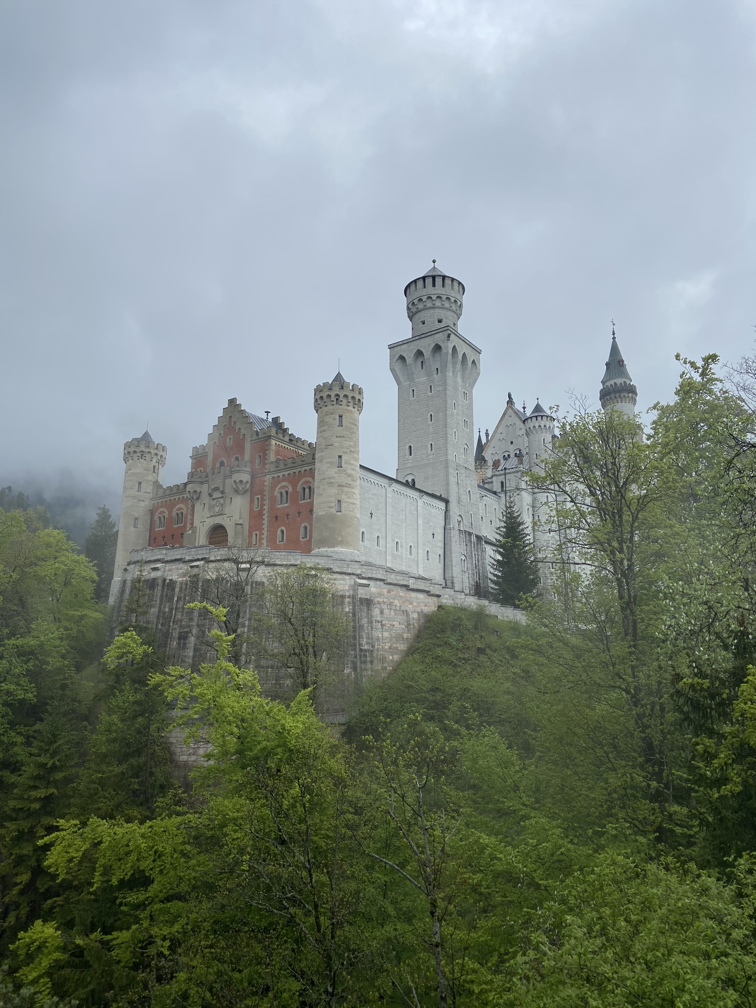 Nós viajamos 130 km por 2 horas, para chegar no Castelo Neuschwanstein, o castelo que serviu de inspiração para os castelos da Disney (Cinderela e Bela Adormecida). Estacionamos em um dos 5 bolsões que existem na cidadezinha (pagamos 10 euros pelo dia), e esperamos pelo ônibus que para em uma trilha próxima à entrada do Castelo. Eu digo próxima, mas é uma caminhada com trechos bem íngremes, então não é tão rápido para chegar na entrada.