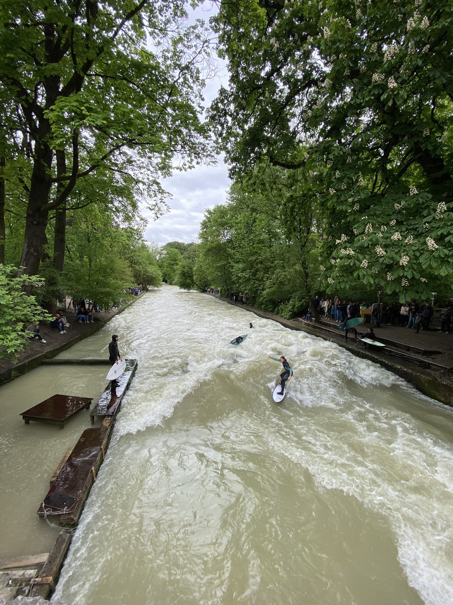 Por nossa conta, caminhamos até o English Garten, pois o Felipe queria ver a galera surfando no rio – e sim, isso realmente existe e pode ser observado o ano todo! Basta buscar por Eisbachwelle no Google, que você vai achar o local para observar esse evento tão peculiar.