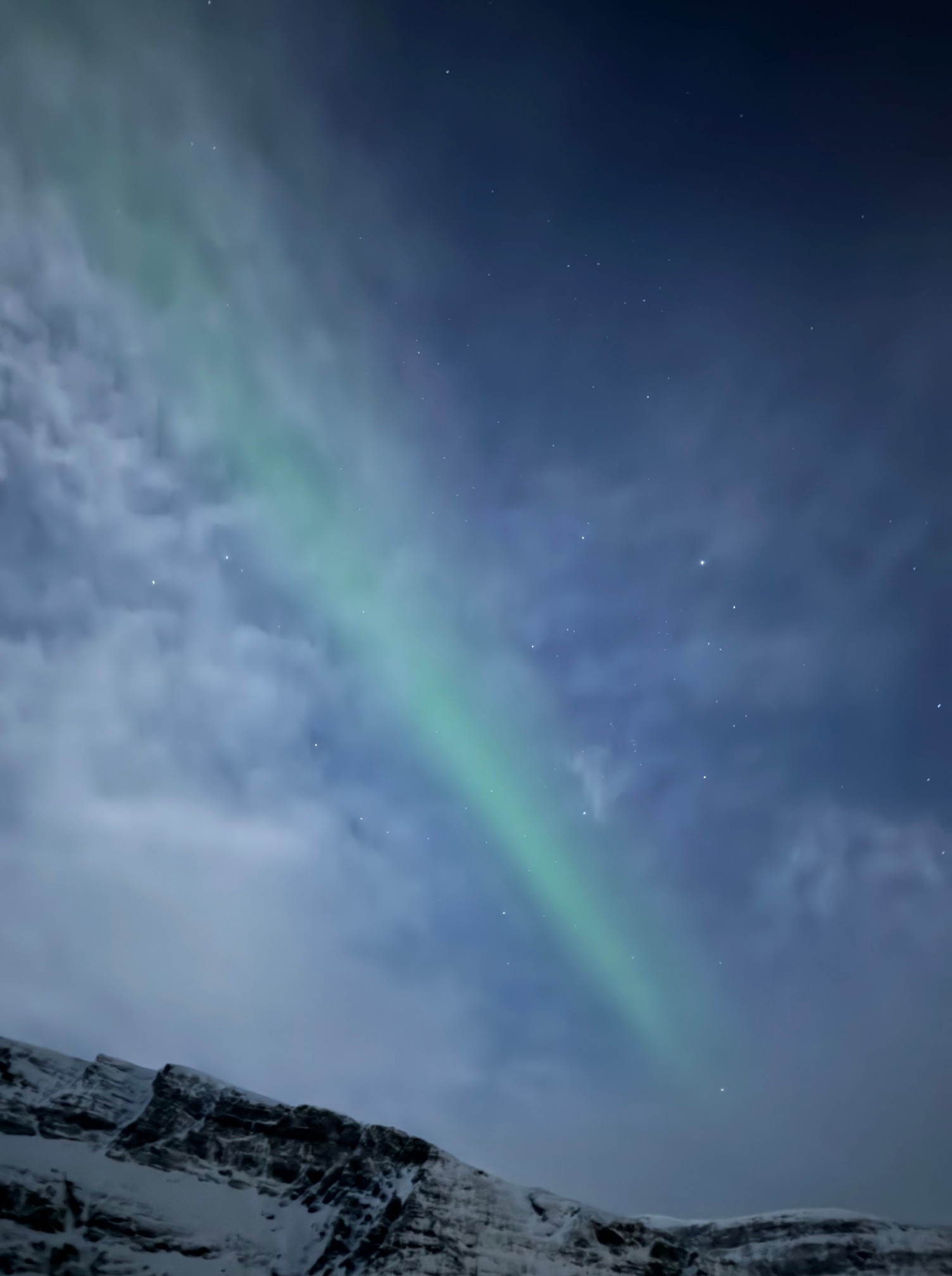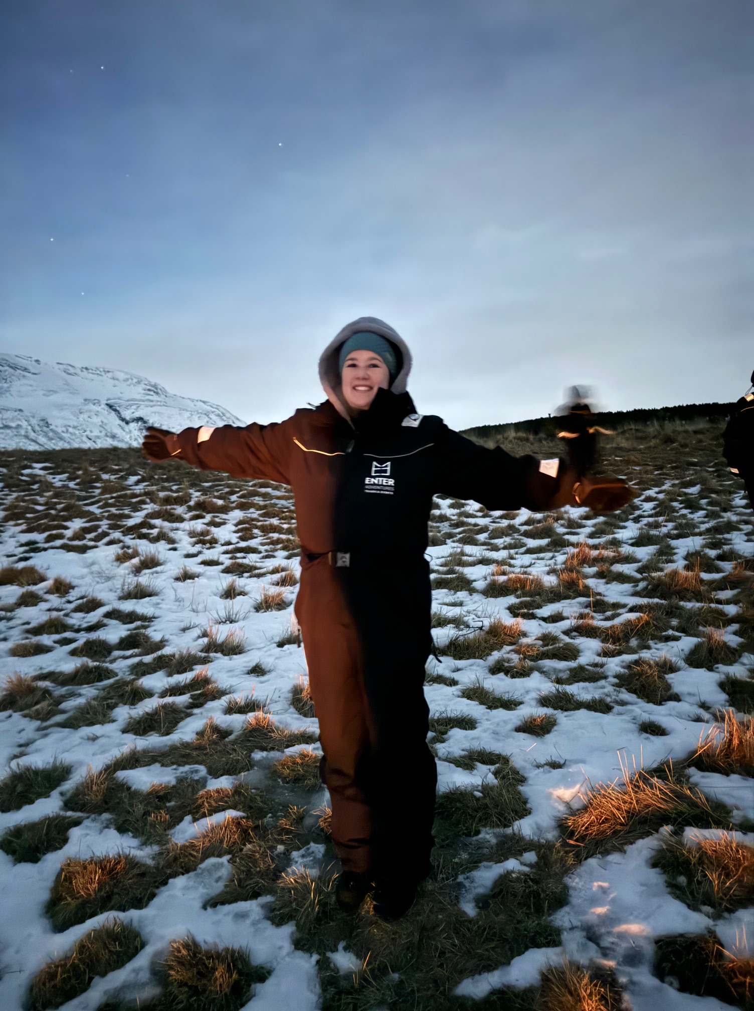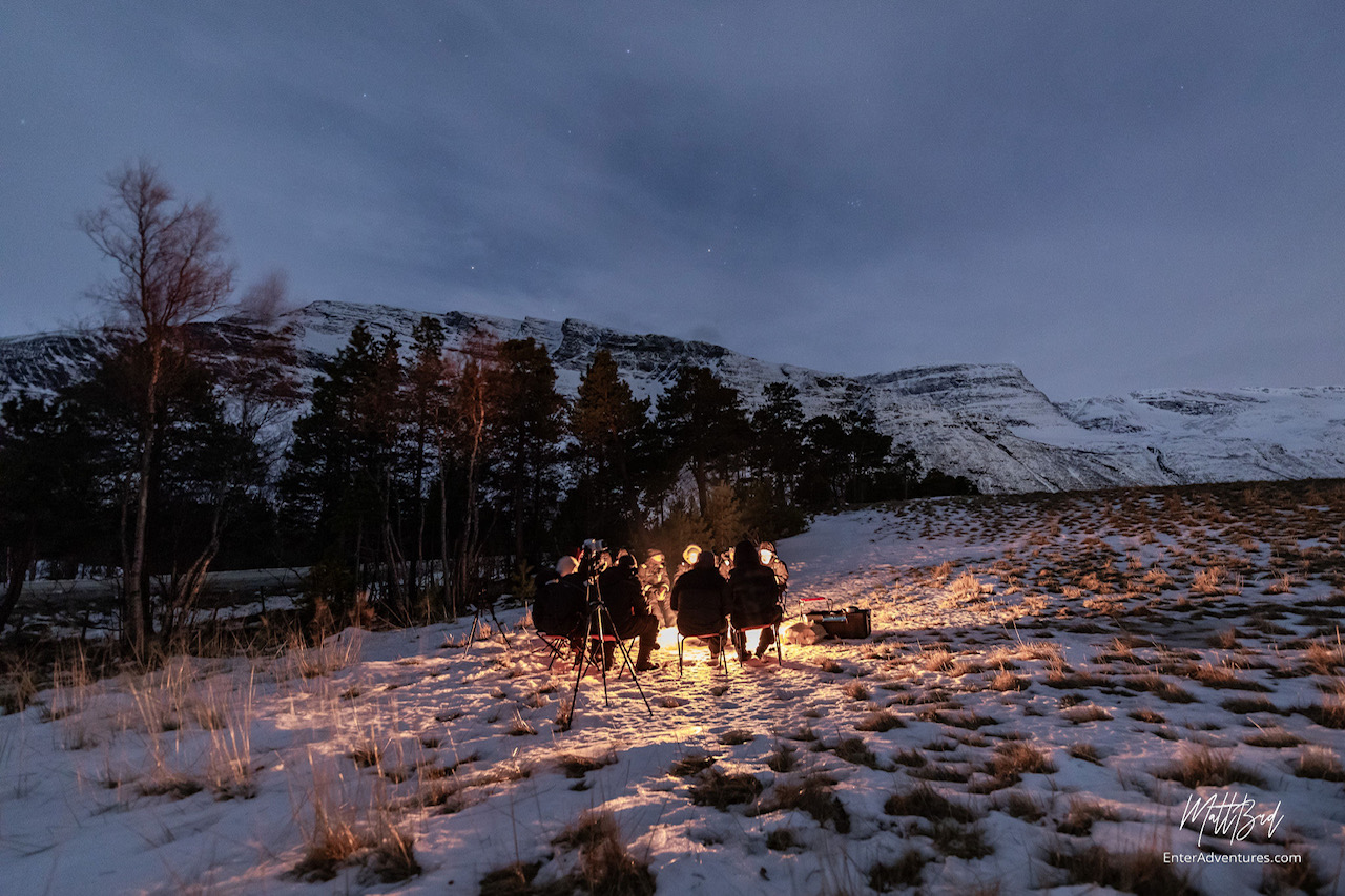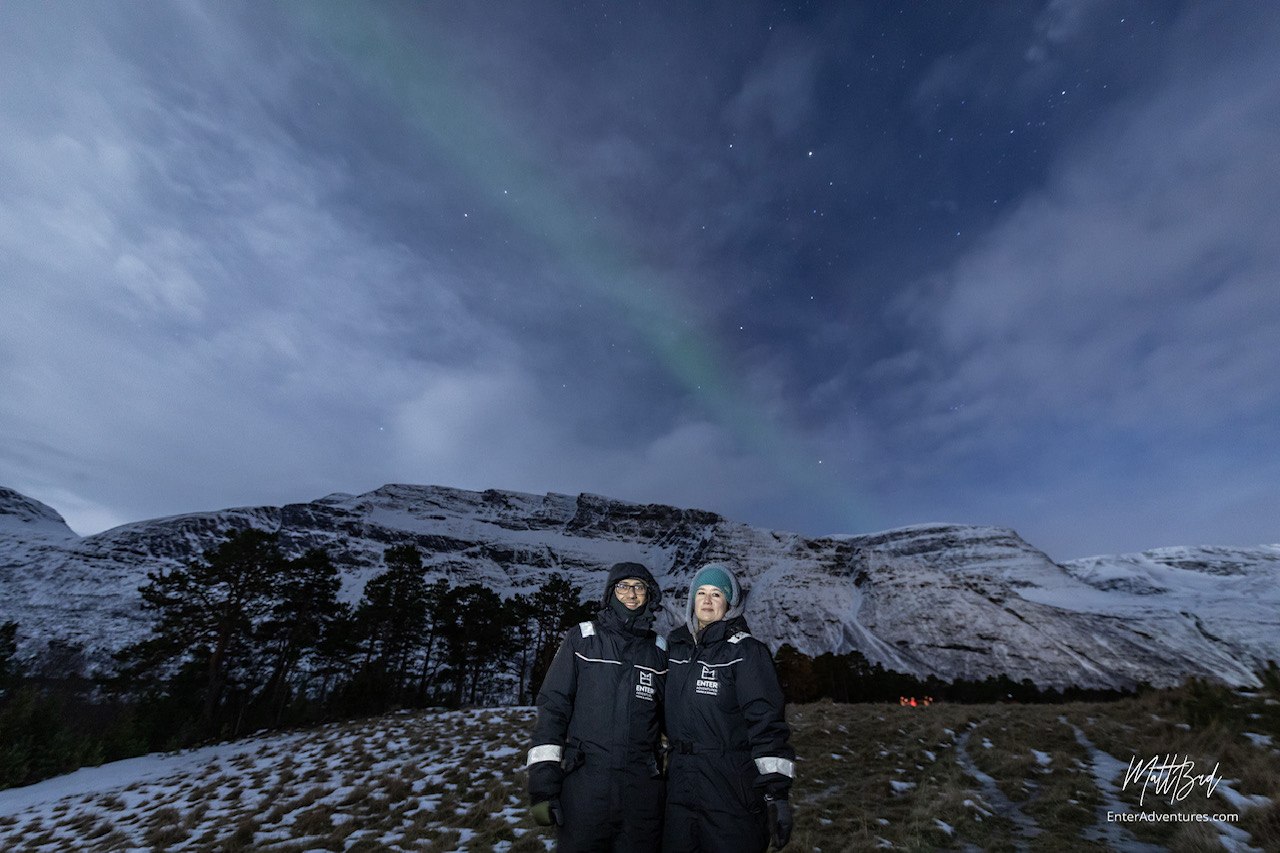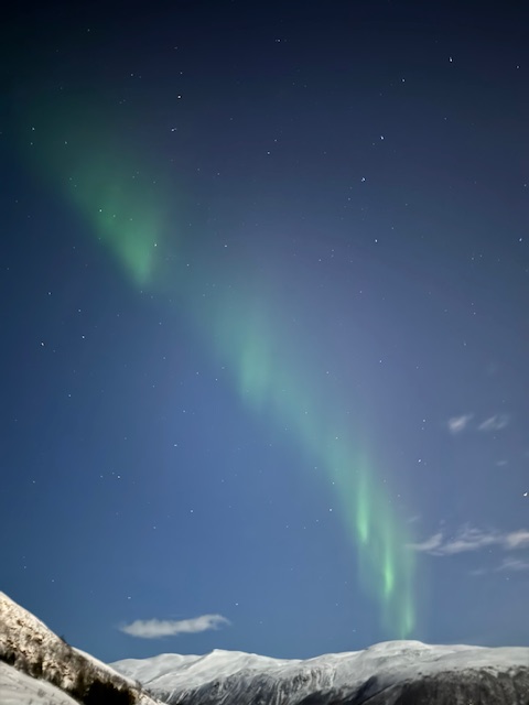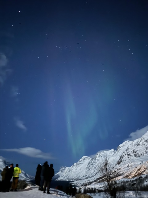 Apesar de ter sido um sucesso nossa caçada solo, queríamos também ter a experiencia de ir com um tour mais estruturado e com suporte de um guia. Como não contratamos o tour com antecedência, tivemos que ajustar nosso plano inicial, e mudar nossa última noite para estar em Tromso. Nós fomos nas agencias maiores, mas mesmo assim estava tudo esgotado. Por sorte encontramos a agência Enter Adventures Tromso, que fica dentro do Enter Amalie Hotel, e eles tinham vagas disponíveis. Nós pagamos 1850 NOK (aproximadamente 160€) por pessoa, para fazer o tour em uma van para máximo de 17 pessoas. O guia vai instruindo o motorista de acordo com as condições do céu. Paramos em um local mais remoto, ele acendeu uma fogueira, jantamos e tomamos chocolate quente. O céu estava coberto de nuvens, mas abriu um pouquinho e conseguimos ver a Aurora Boreal novamente!