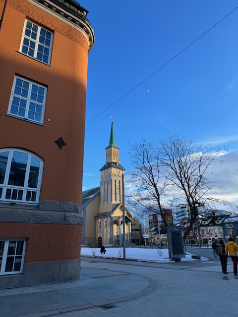 O Felipe pegou um folheto em uma loja de souvenir que falava sobre um Free Walking Tour, mandou mensagem para o contato e confirmamos o tour para 10 horas da manhã do dia seguinte. O Free Walking Tour (@free_walking_tour_tromso no Instagram) tem como ponto de partida a Catedral de Tromso, que fica na rua Kirkegata 7. Pontualmente às 10 horas, o Maurício nos recepcionou e fez uma rápida explicação de como o tour ia funcionar – comunicação 100% em inglês, com um extra de poder usar o português/espanhol, já que o Maurício é Argentino. 😊