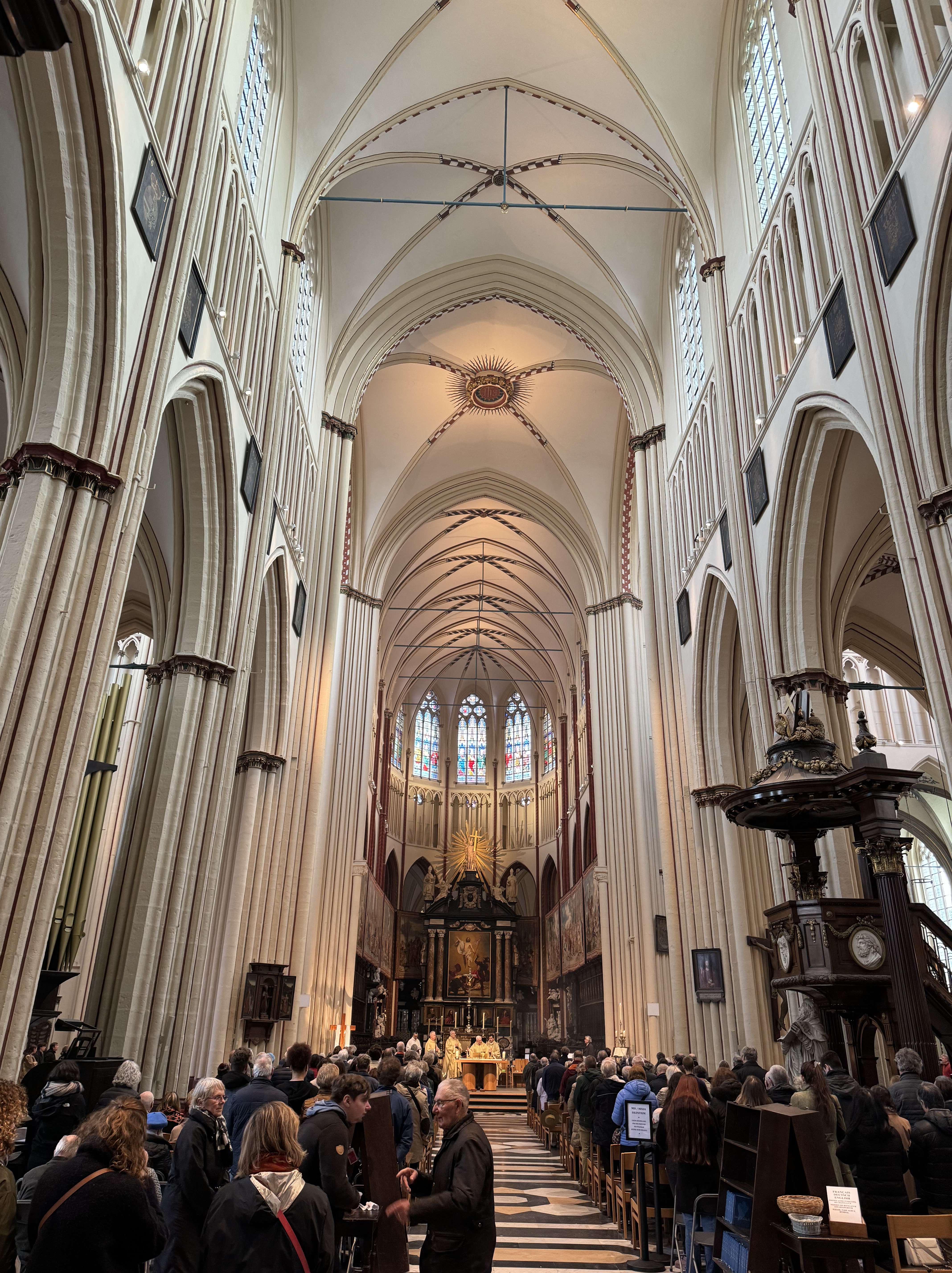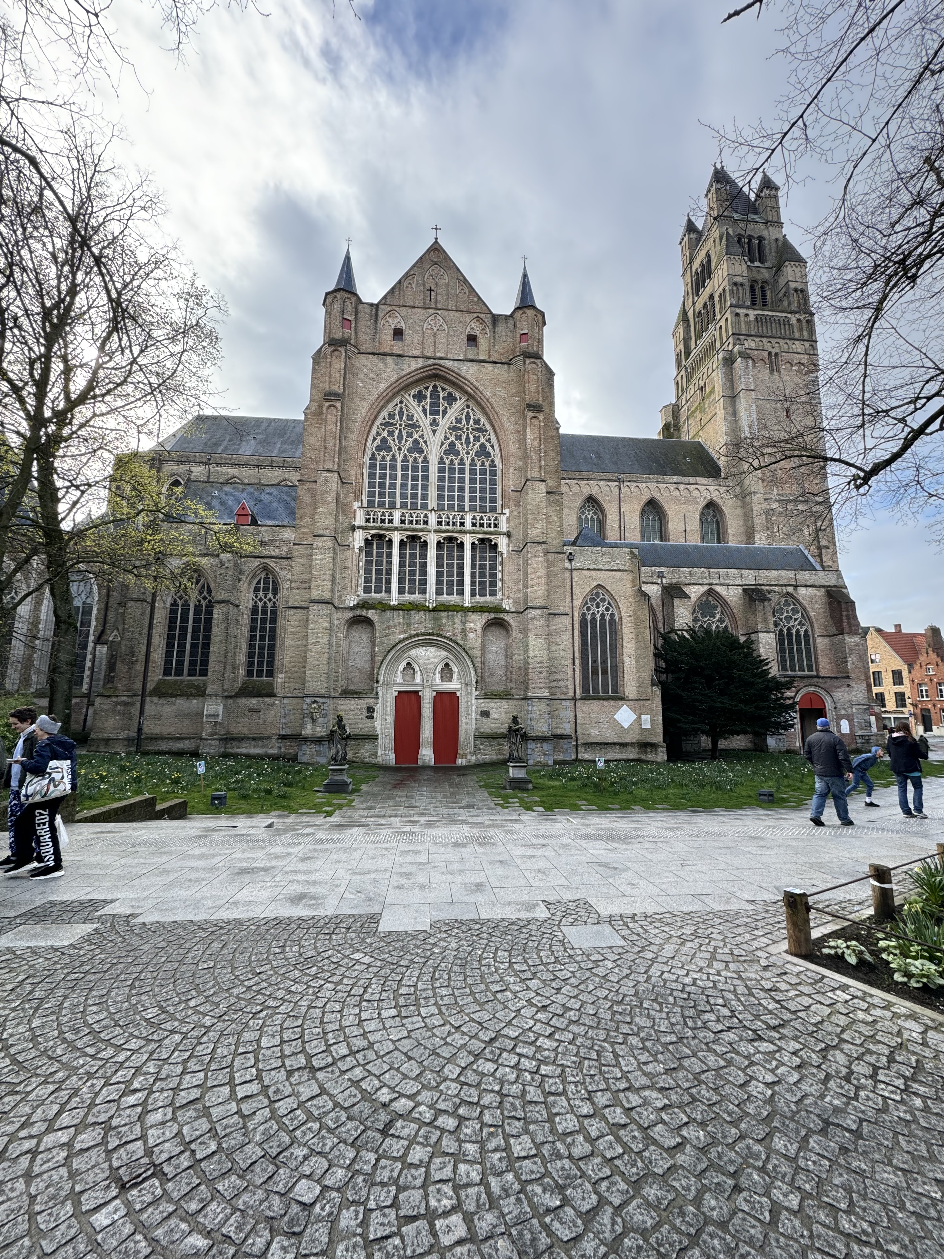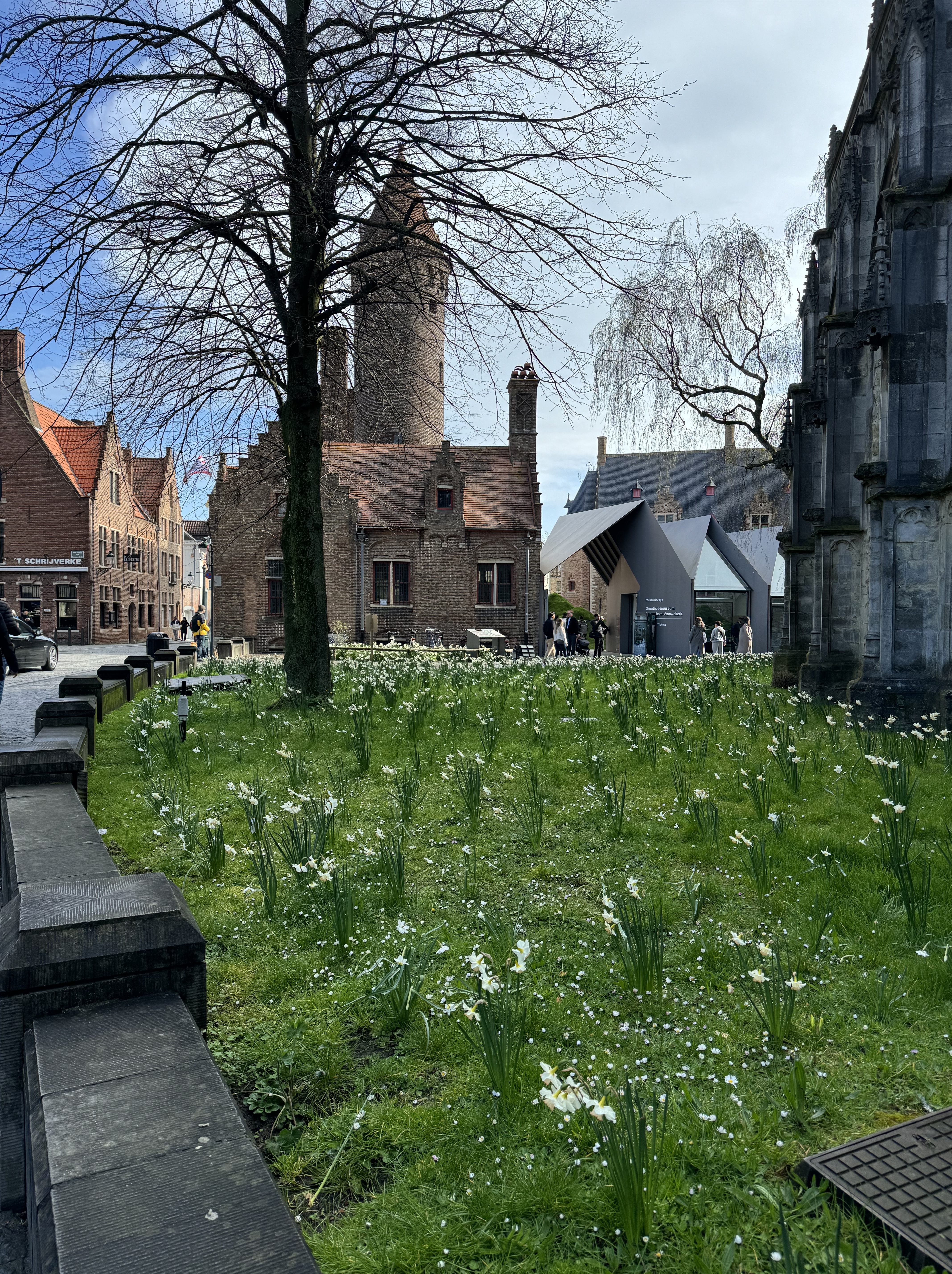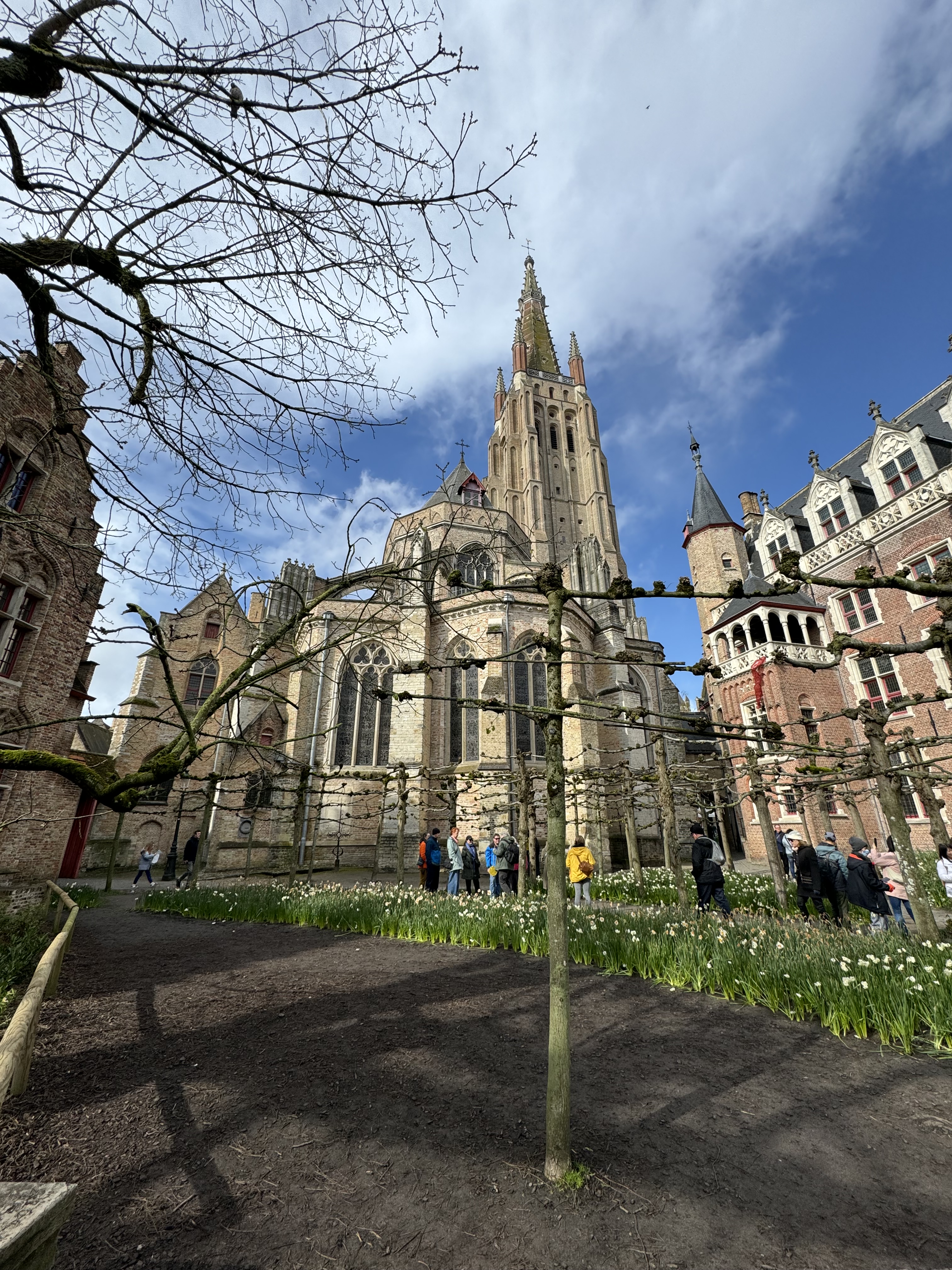 Nós estacionamos o carro próximo ao nosso ponto de partida, a Catedral de São Salvador, a igreja mais antiga da cidade. Ela estava aberta somente para a missa, mas conseguimos entrar para dar uma espiada, e ela é bem bonita por dentro. Em seguida, nós continuamos a caminhada até a Igreja de Nossa Senhora, com uma torre de tijolos de 115.5 metros de altura (a segunda maior do mundo), e no interior está a Madonna de Bruges – única obra de Michelangelo Buonarroti que se encontra fora da Itália. Nós não conseguimos entrar pois era um feriado católico e a igreja estava aberta somente para missa (geralmente nesses casos, fica alguém na porta de entrada controlando os turistas). Contornando a igreja, passamos na frente do Gruuthusemuseum, um museu que mostra a jornada de 3 períodos importantes da história de Bruges, e continuando até a parte de trás da igreja, nós chegamos na famosa Bonifaciusbrug, uma das pontes mais novas da cidade mas que compõe o ambiente criando uma atmosfera romântica e uma vista linda.