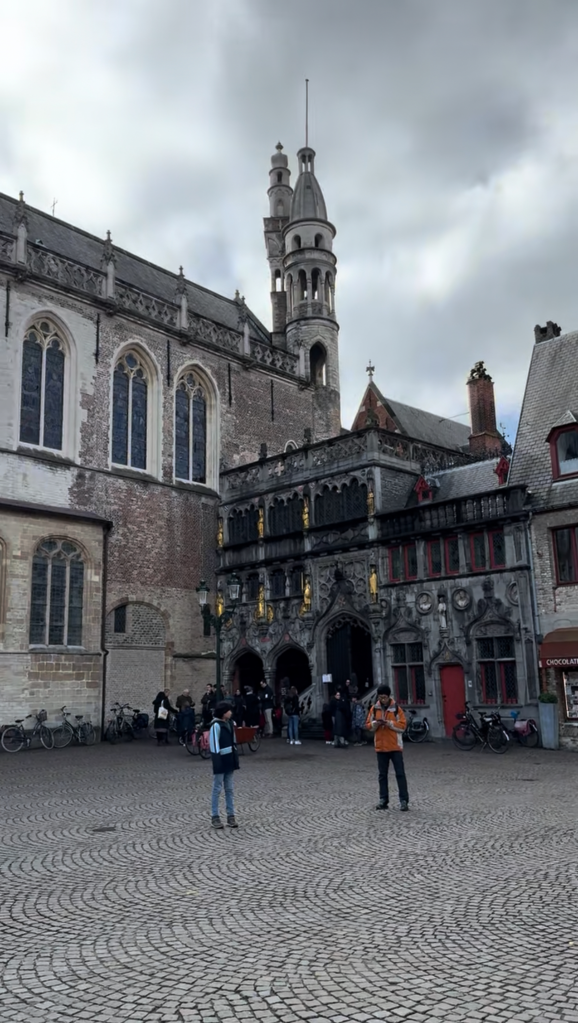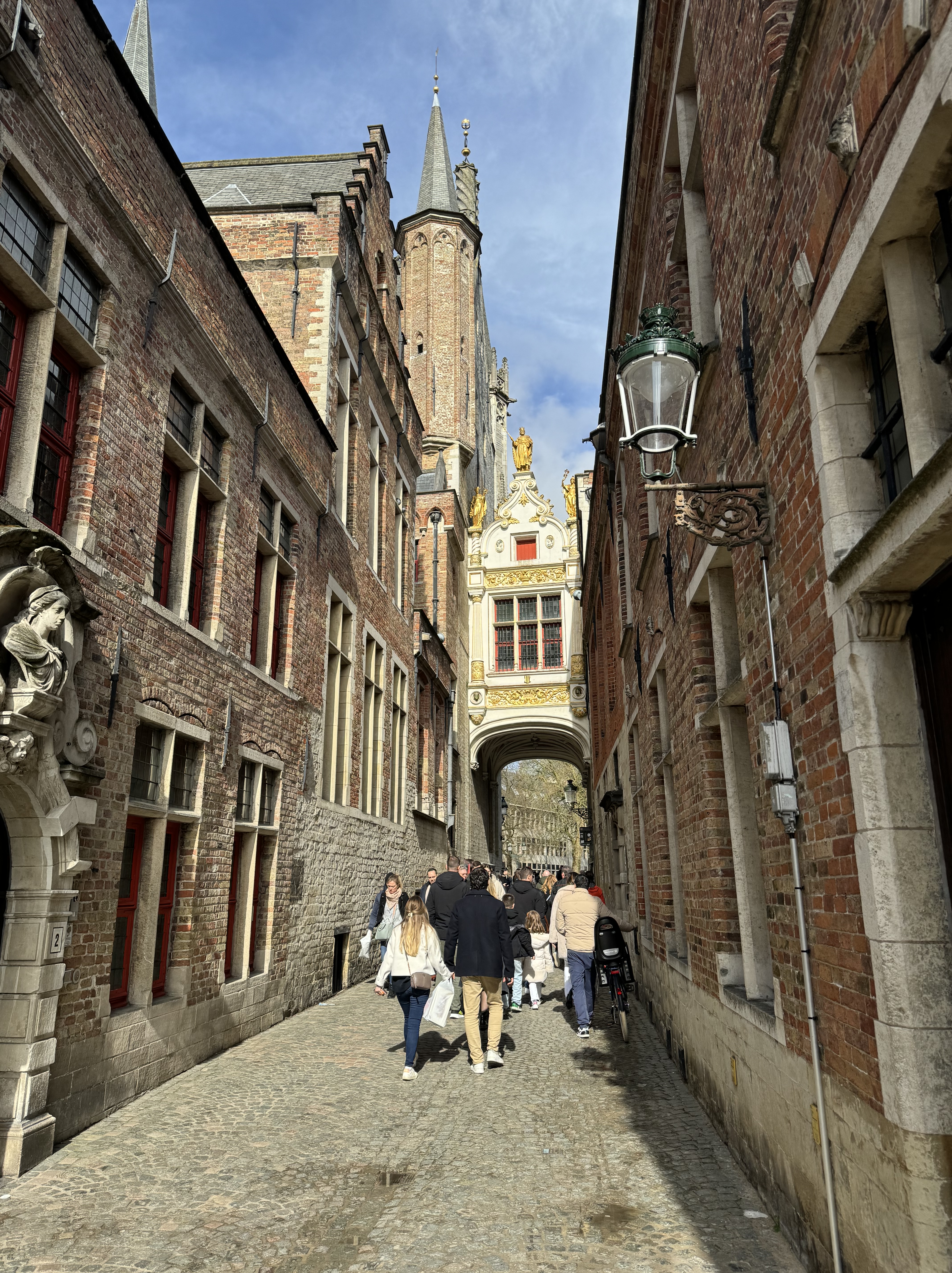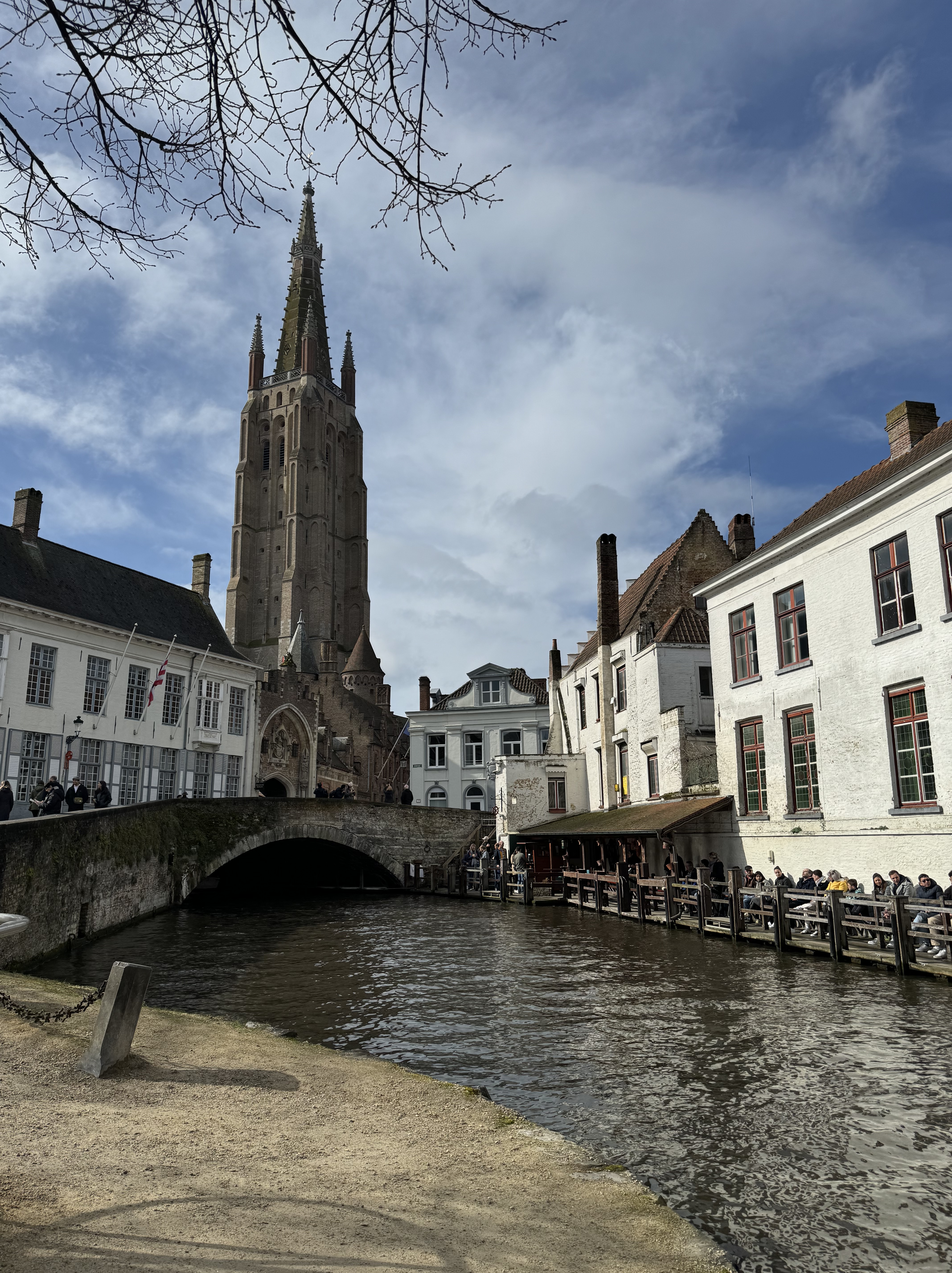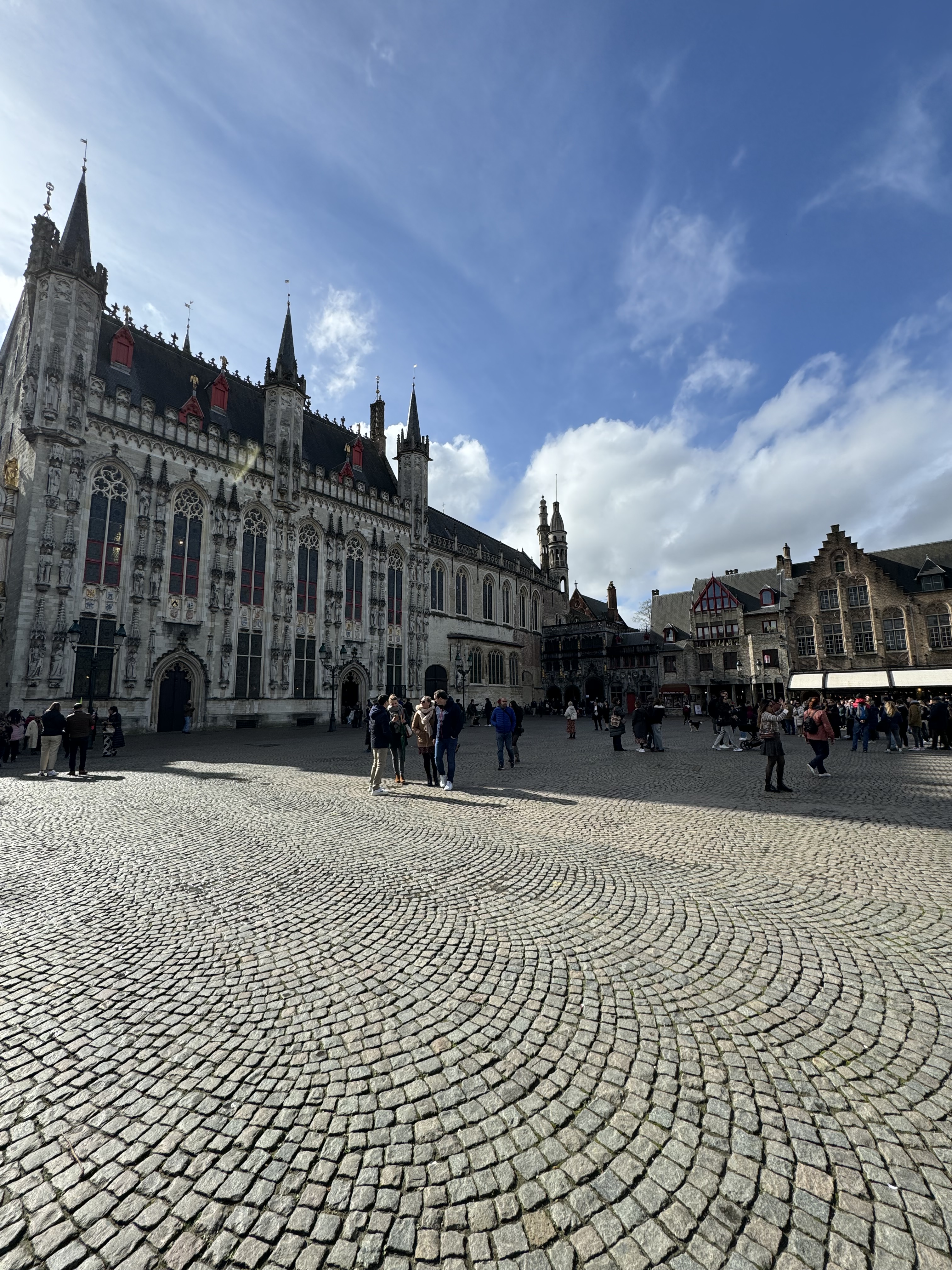 Seguimos nossa caminhada à beira do rio Dijver, até a Rosary Quay, local que ficou muito famoso pelas fotos no Instagram. Dali pode-se observar os barcos passando pelos canais, e ao fundo estão alguns restaurantes e bares. Passamos pela Huidenvettersplein, uma praça cheia de restaurantes com mesas na calçada, e depois de passar por baixo da Brugse Vrije (uma pequena ponte que liga 2 edifícios), chegamos na De Burg, uma praça onde estão os seguintes edifícios: Stadhuis Bruuge, a antiga corte da justiça que hoje guarda arquivos importantes sobre a cidade; a Stadhuis, prefeitura de Burges e a Basilica of the Holy Blood, famosa por manter uma relíquia com o sangue de Cristo – também por conta do feriado, não conseguimos entrar.