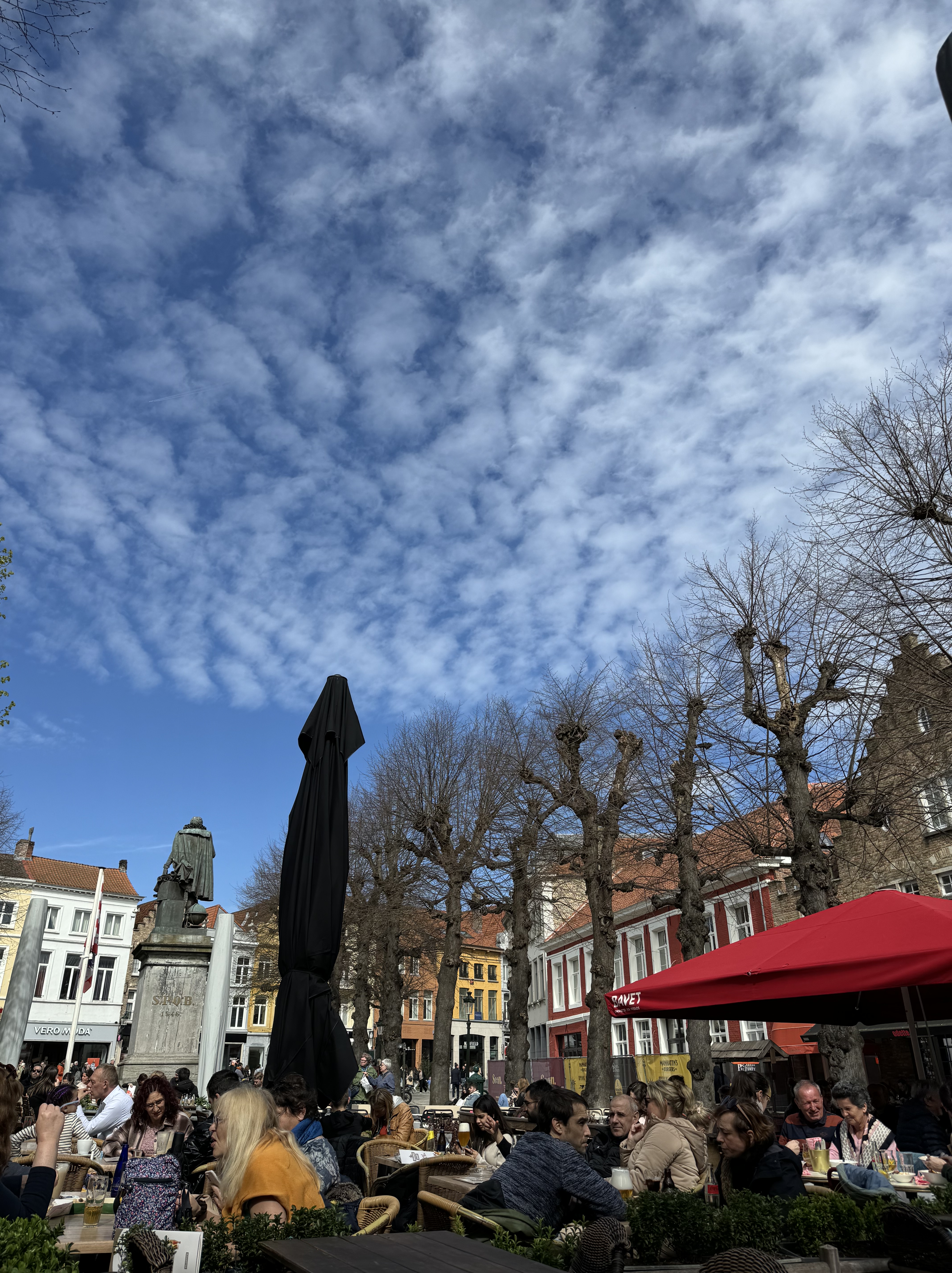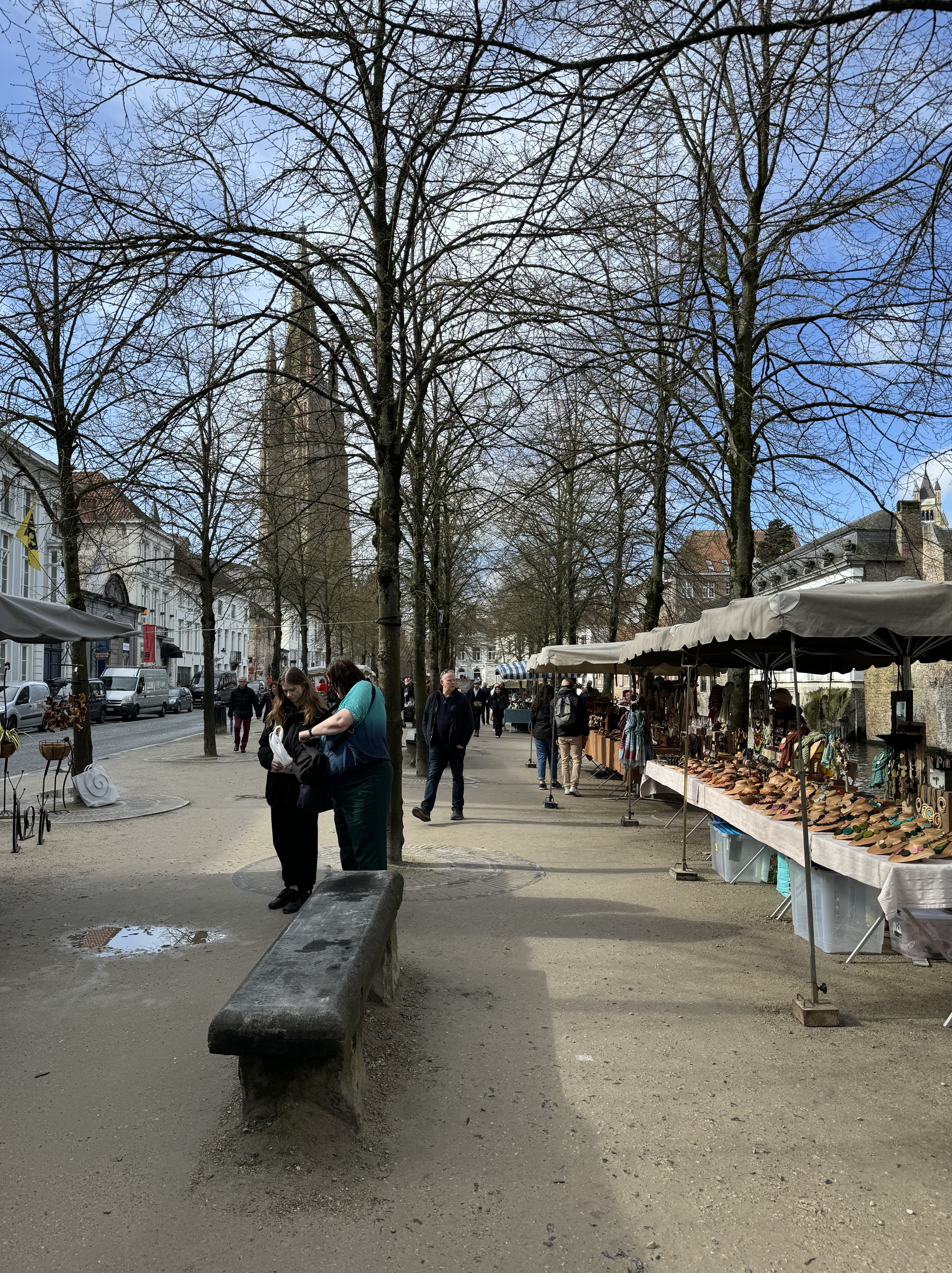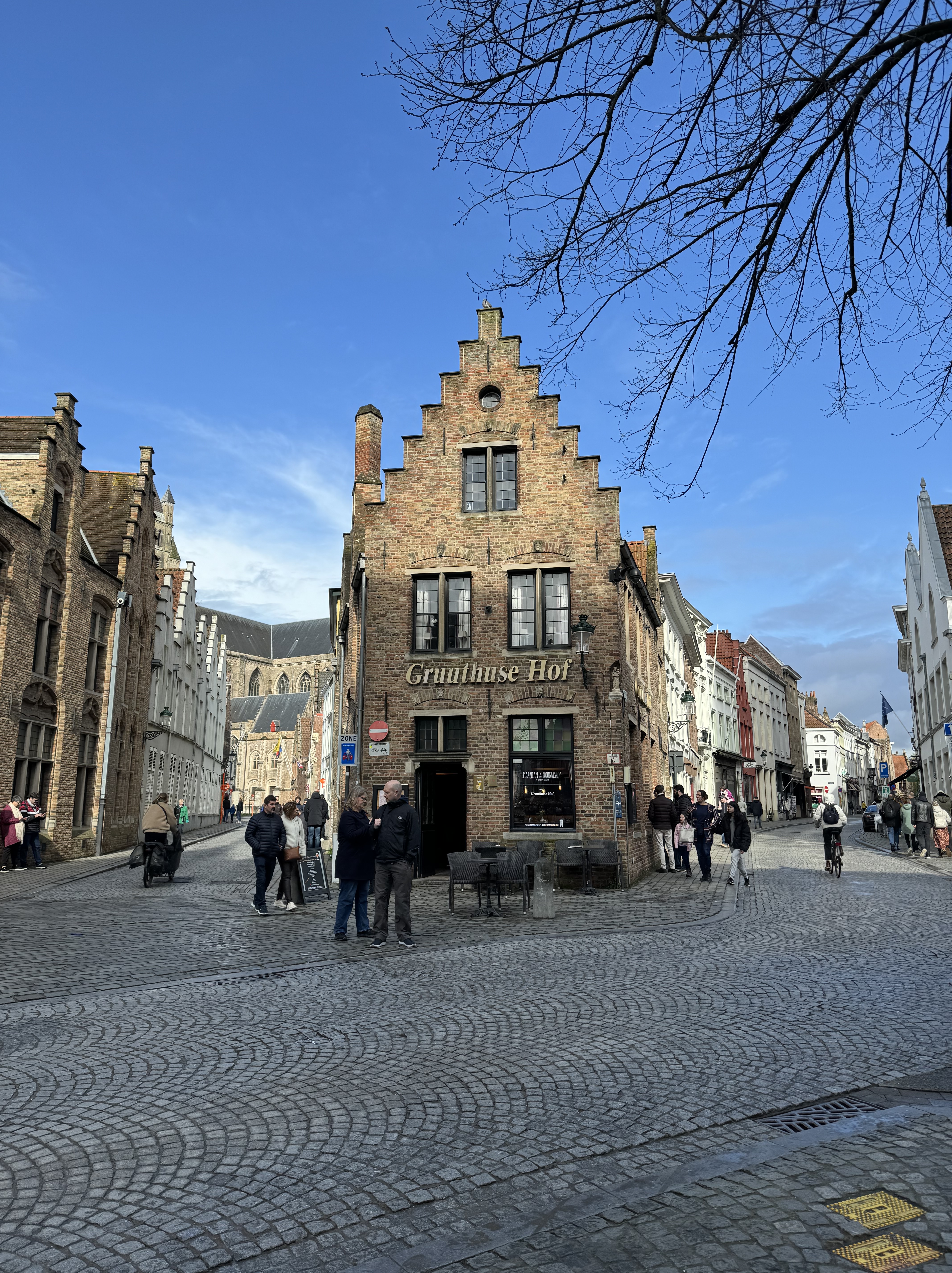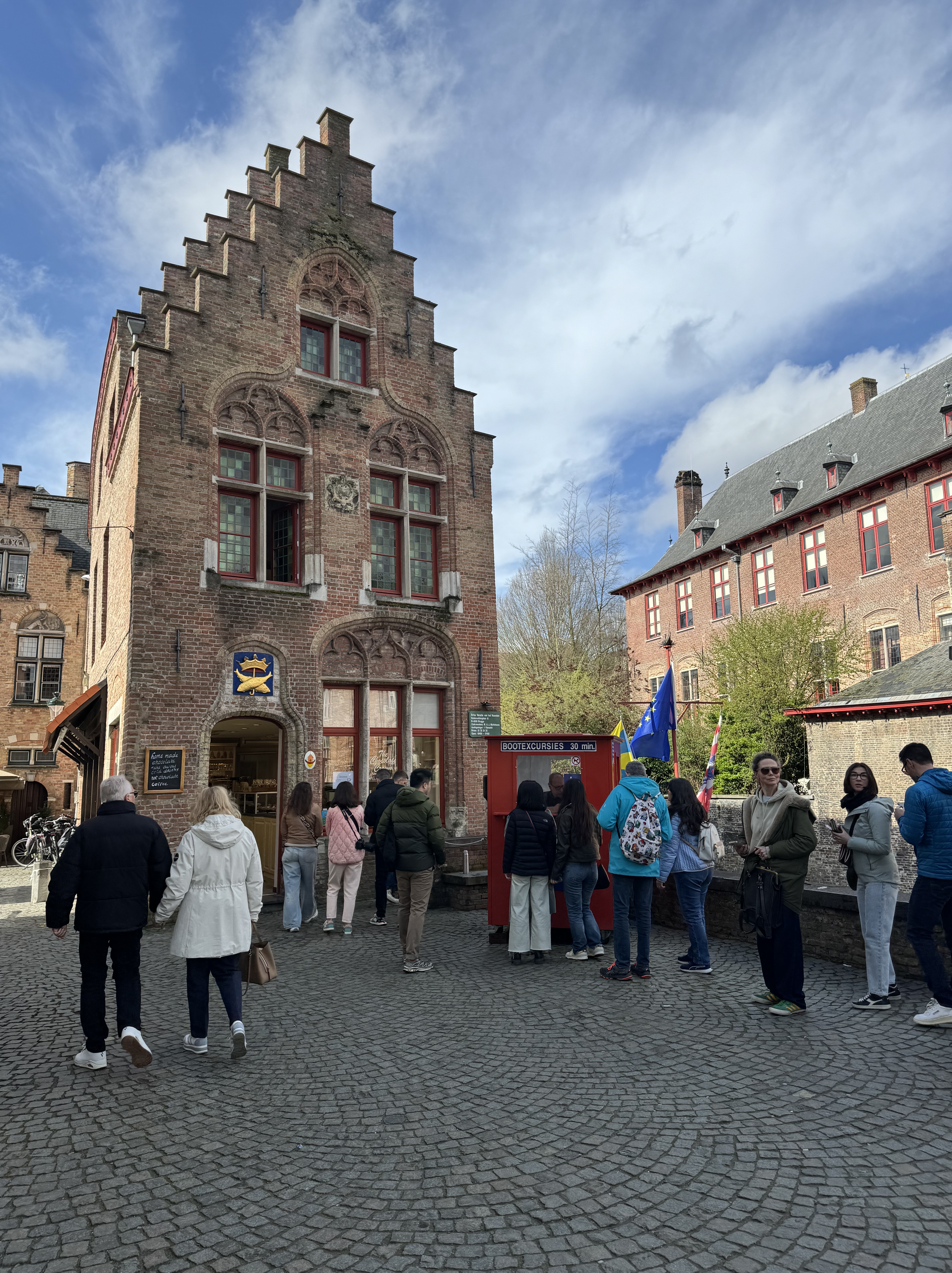 Seguimos nossa caminhada à beira do rio Dijver, até a Rosary Quay, local que ficou muito famoso pelas fotos no Instagram. Dali pode-se observar os barcos passando pelos canais, e ao fundo estão alguns restaurantes e bares. Passamos pela Huidenvettersplein, uma praça cheia de restaurantes com mesas na calçada, e depois de passar por baixo da Brugse Vrije (uma pequena ponte que liga 2 edifícios), chegamos na De Burg, uma praça onde estão os seguintes edifícios: Stadhuis Bruuge, a antiga corte da justiça que hoje guarda arquivos importantes sobre a cidade; a Stadhuis, prefeitura de Burges e a Basilica of the Holy Blood, famosa por manter uma relíquia com o sangue de Cristo – também por conta do feriado, não conseguimos entrar.