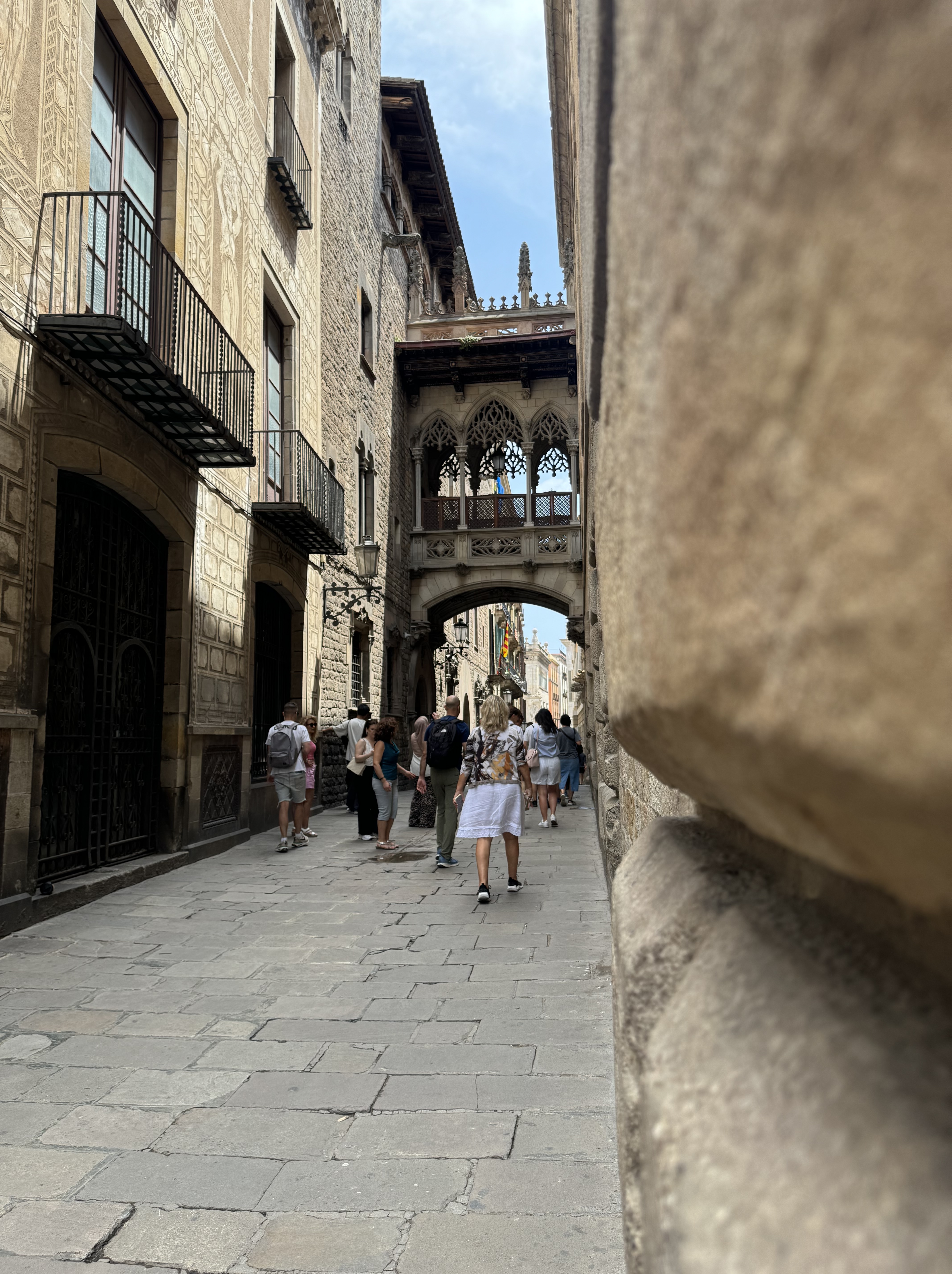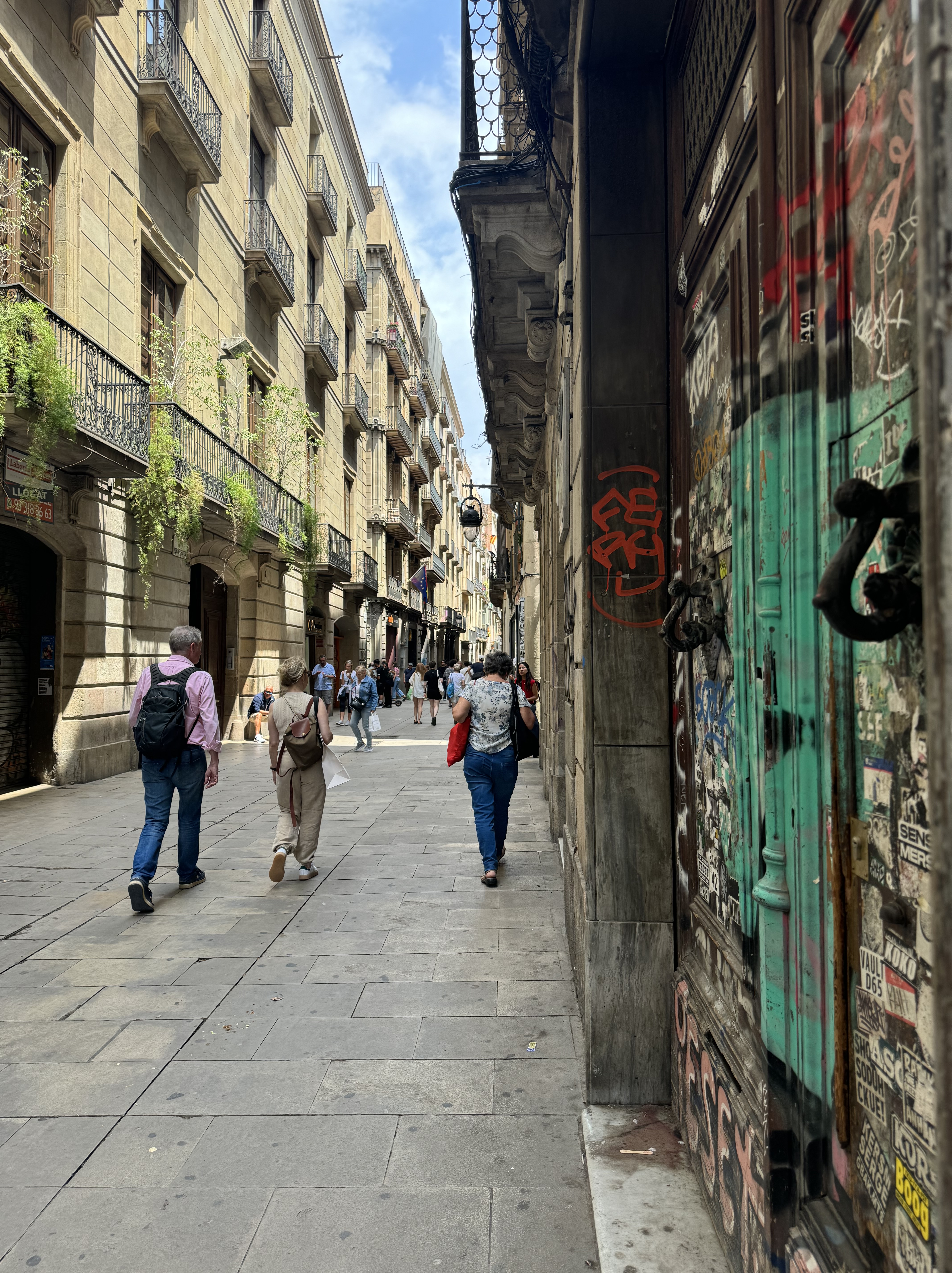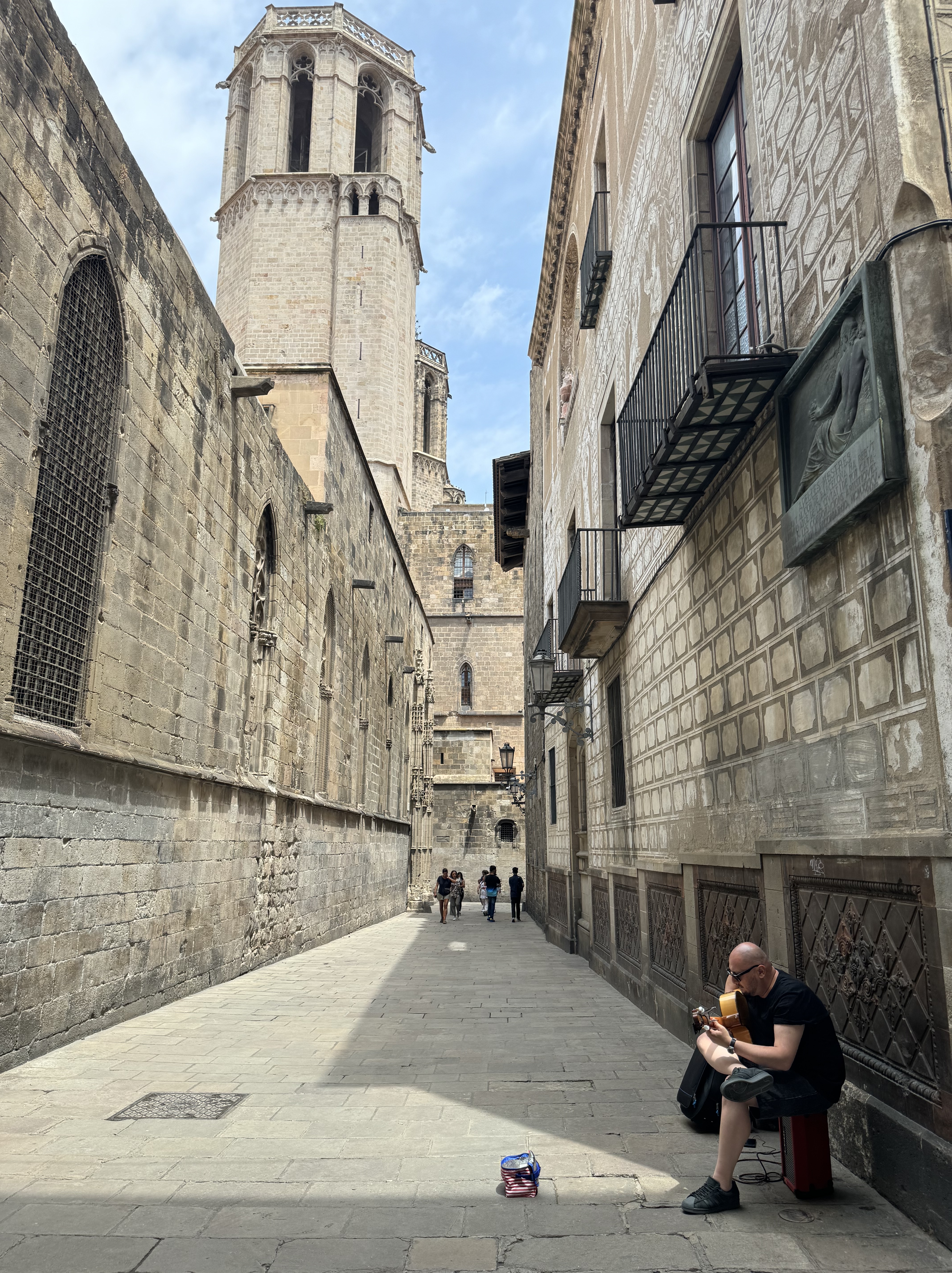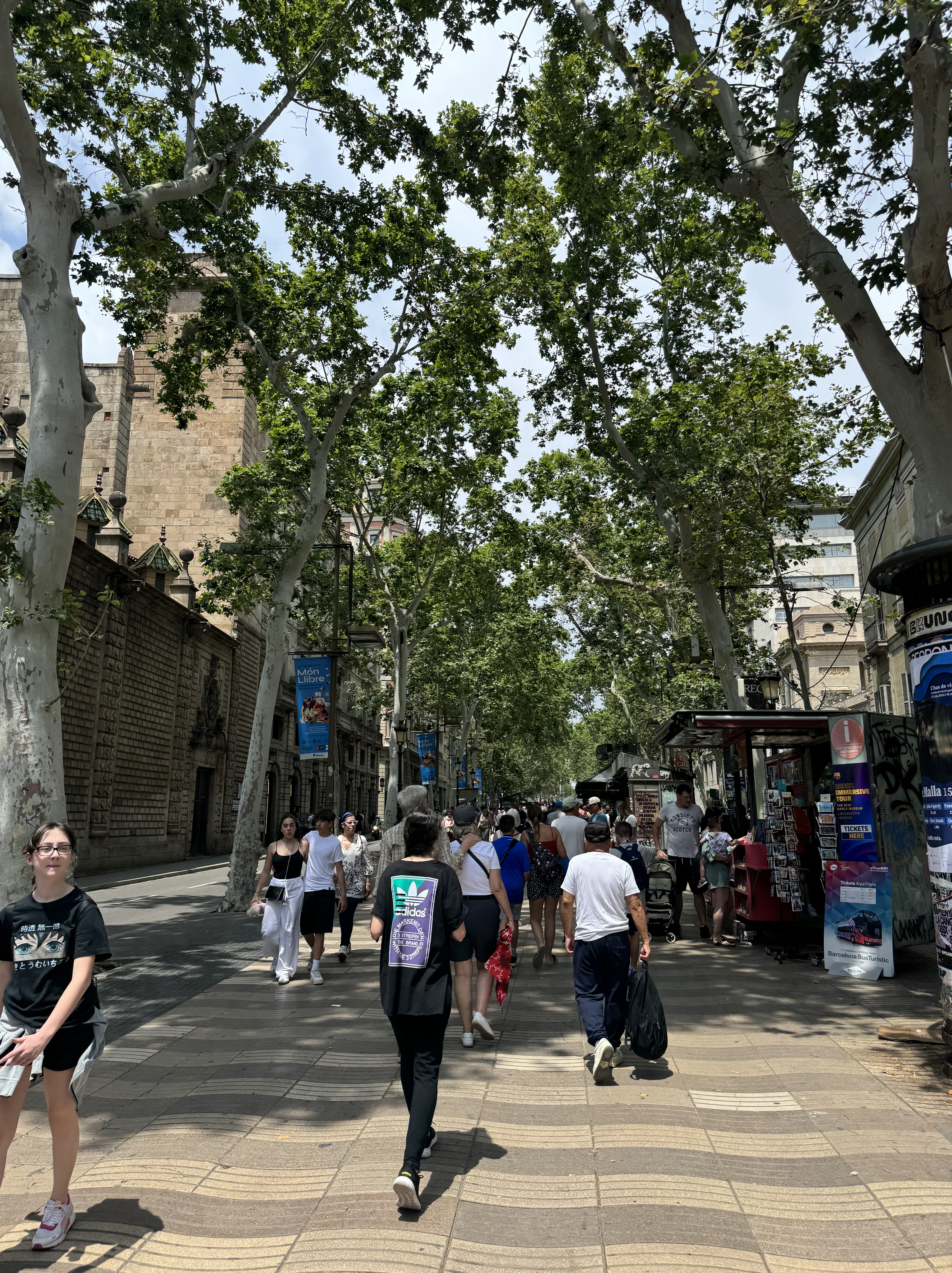 Caminhamos pela La Rambla, um calçadão cheio de artistas de rua, barraquinhas de comida e souvenir, e rodeada de restaurantes e cafés. Pouco depois do final do calçadão, está o Mercat de la Boquería: um mercado municipal com barracas de frutas, frios e carnes, onde também vale uma parada para almoçar – infelizmente no dia que estivamos por lá, estava fechado. Do outro lado da avenida, acessamos a Ciutat Vella (Bairro Gótico) – centro histórico com ruas estreitas, e cheias de pontos interessantes para conhecer.