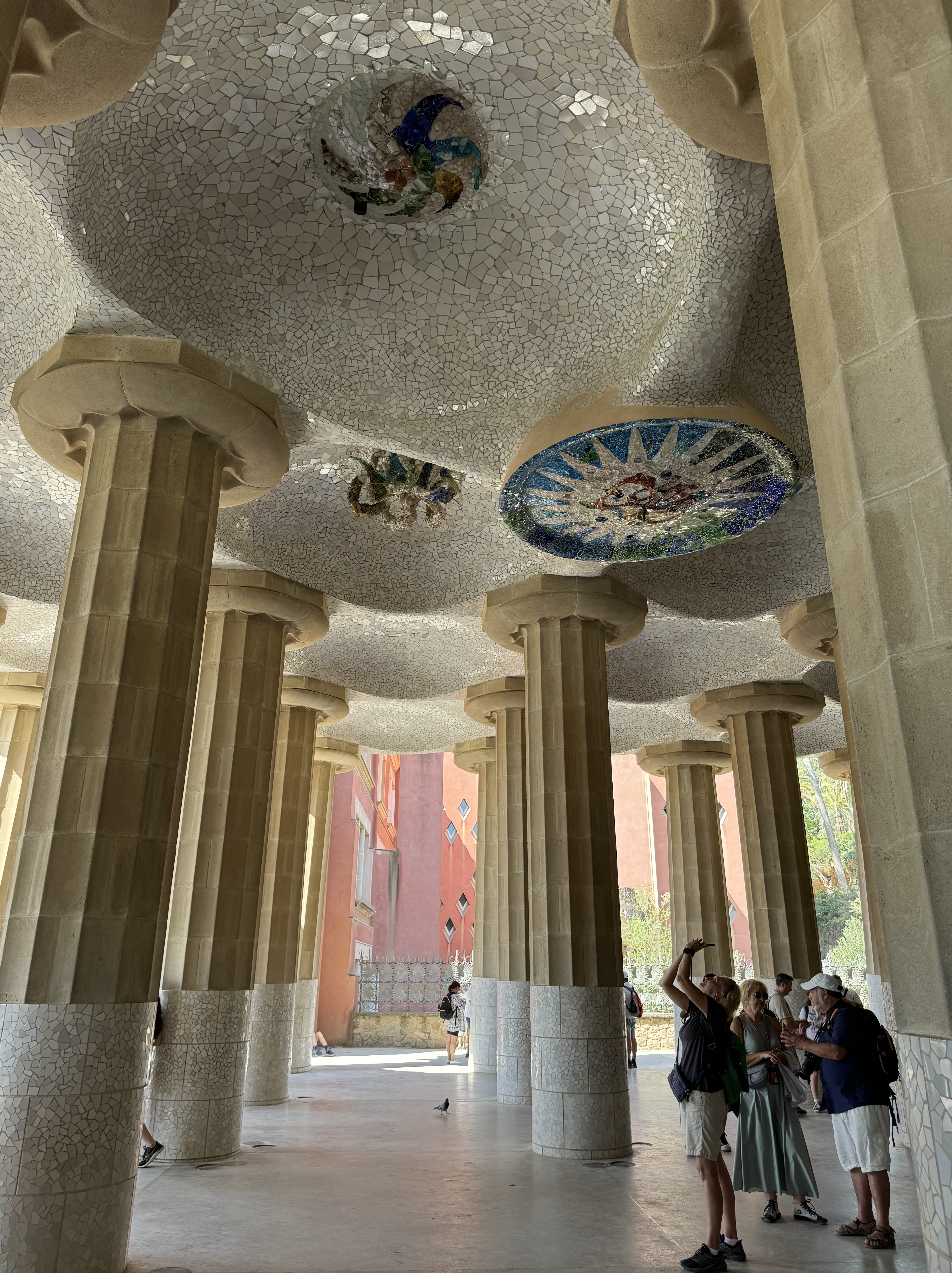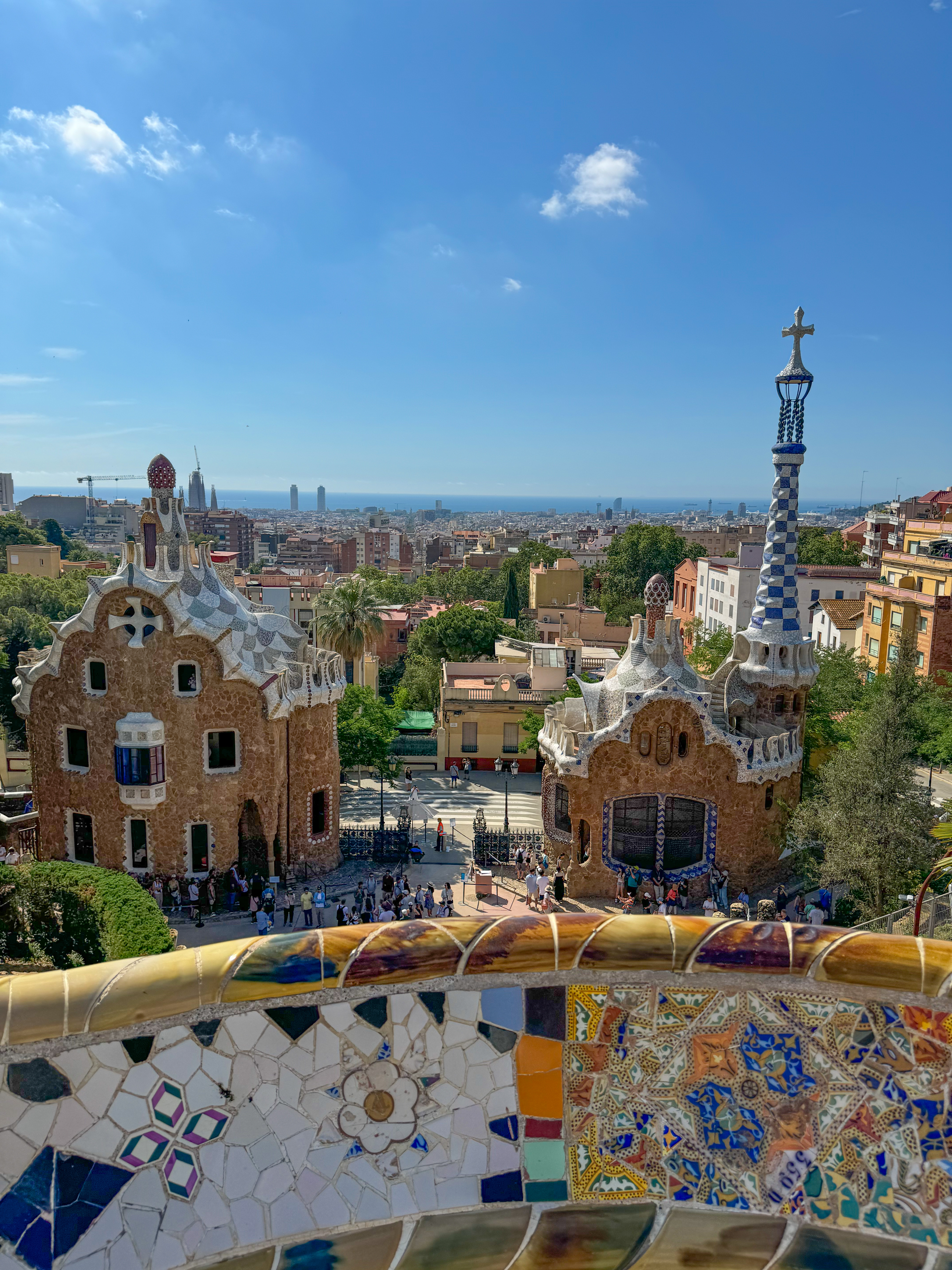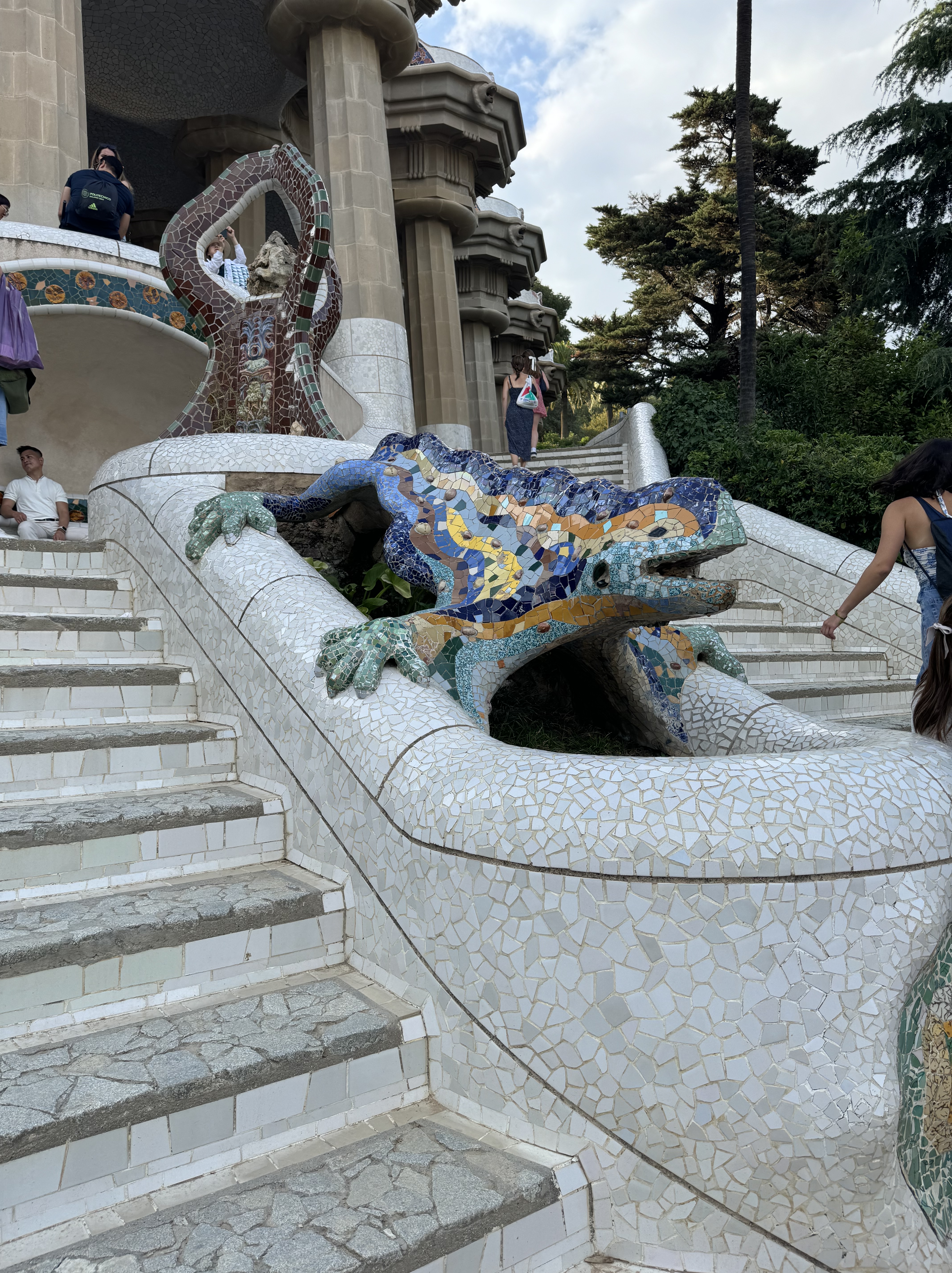 Dali nós partimos para o último ponto do nosso roteiro, o Park Güell (site oficial). Assim como a Sagrada Família, vale a pena comprar os ingressos com antecedência pois é um local muito procurado pelos turistas. Eu achei que valeu MUITO a pena comprar o ingresso com guia, pois pude conhecer muito sobre o contexto do trabalho de Gaudí. O proprietário do terreno, Eusebi Güell, contratou Gaudí para realizar o projeto de construção de edifícios residenciais na área – que se tornou um fracasso já que não houve muito interesse da alta elite em ter uma casa tão afastada do centro da cidade. Por fim, o terreno foi doado para a prefeitura, com a condição de que o terreno nunca fosse revendido, e que jamais se tornasse uma área residencial/comercial – o valor do ingresso é utilizado na manutenção do local e dos edifícios dentro do parque.