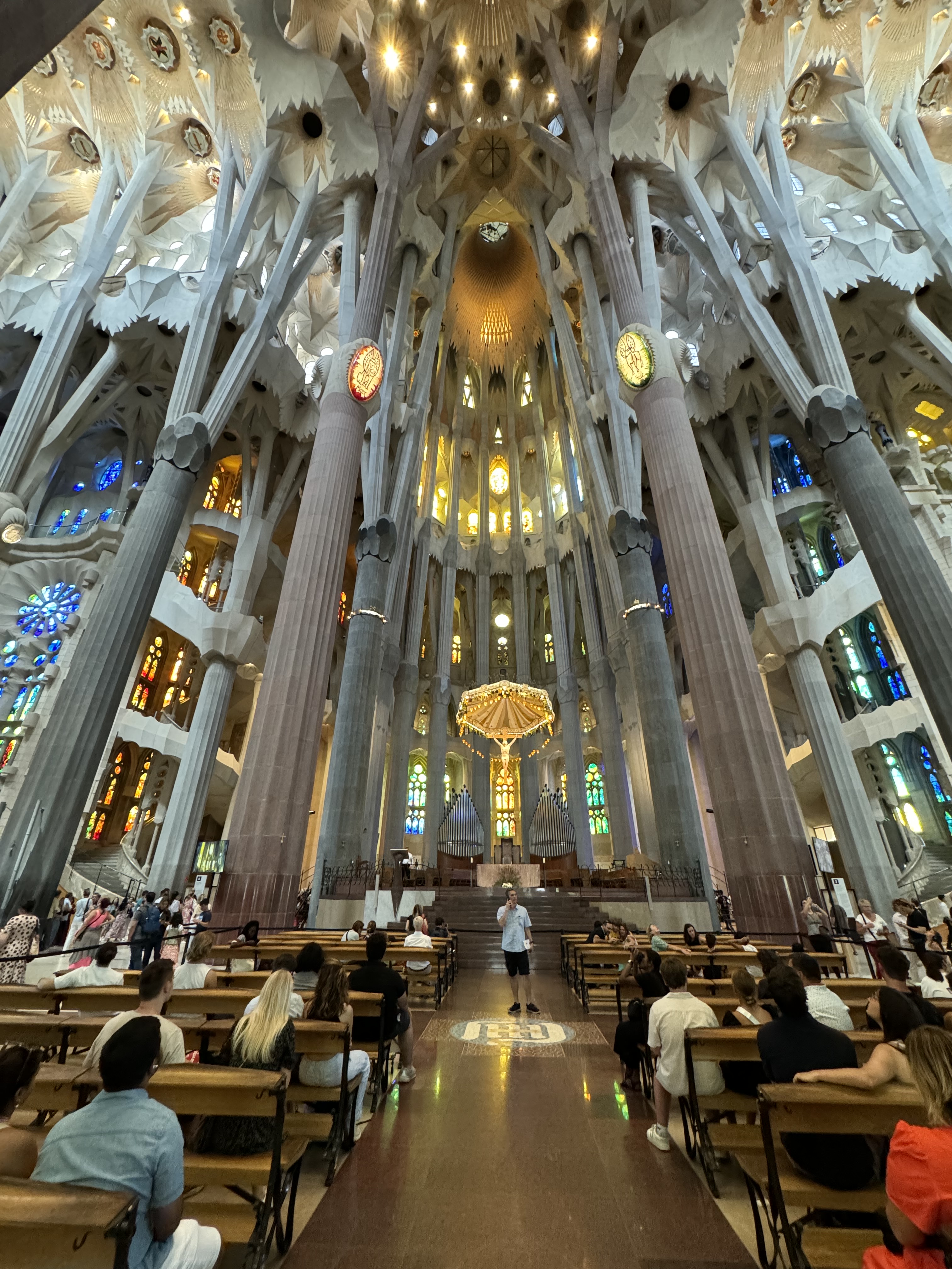 Iniciamos nosso passeio em uma das igrejas mais badaladas do mundo, a famosa obra de Gaudí: Basílica da Sagrada Família. Nós compramos o ingresso no site oficial com algumas semanas de antecedência – por ser um dos lugares mais concorridos de Barcelona, vale a pena se antecipar e garantir que você vai conseguir entrar. Existem 4 tipos de ingresso: o mais simples dá o direito à entrada, e baixando o aplicativo você tem acesso ao áudio tour; o tour completo inclui a visita em uma das torres, com uma vista linda da cidade de Barcelona. Independente de qual tour voce vai escolher, não deixe de visitar o interior da Basílica – é de tirar o folego!