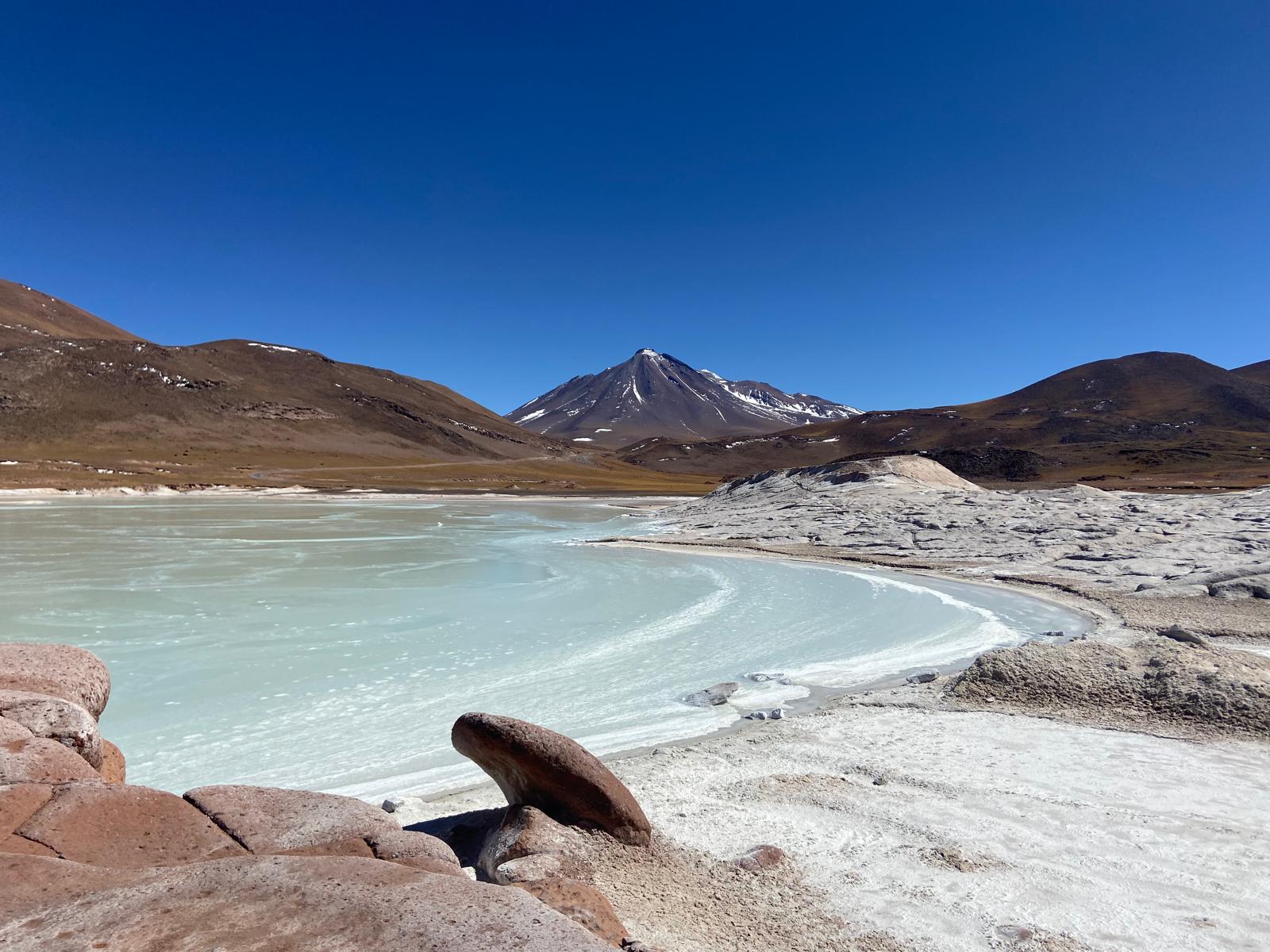 Localizadas a mais de 4.000 metros de altitude, no caminho para o Salar de Tara, estas lagoas são um espetáculo à parte. As Lagunas Altiplânicas, como a Miscanti e a Miñiques, impressionam pelo seu intenso azul-cobalto, contrastando com as montanhas e a areia branca do deserto. Nas proximidades, Piedras Rojas (Pedras Vermelhas) é uma formação única de rochas de cor ferruginosa, que criam um cenário dramático e fotogênico às margens da Laguna Colorada. O conjunto forma uma paleta de cores inesquecível.